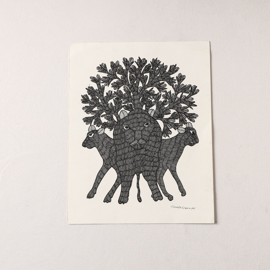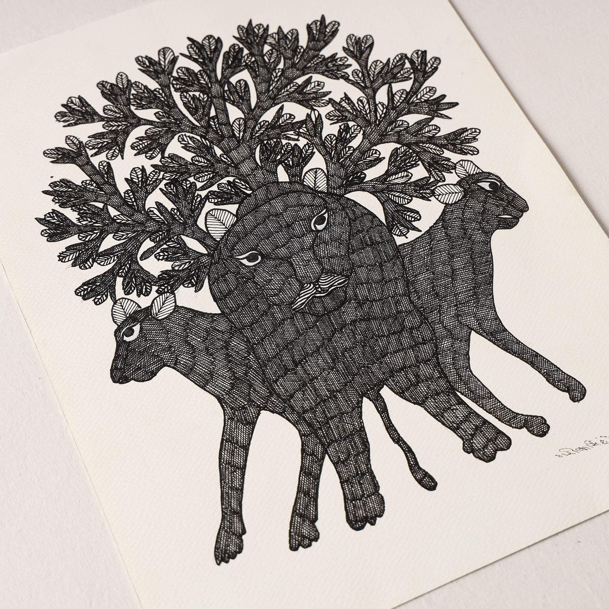 This original work of gond art is done on art paper base made using tanon ink. This Indian tribal art comes from Bhopal from the family of Gariba Singh Tekam. A wonderful painting for the discerning decor aficionado or a gift for an art lover. These are priceless collectibles.