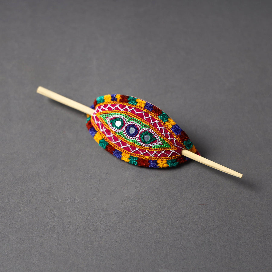 Handcrafted hair pin made from cruelty free kutch leather with hand embroidered mirror work. This hair pin holds hair well with the help of a wooden slide stick. The Kutch embroidery is a handicraft and textile signature art tradition of the tribal community of kutch district in Gujarat.