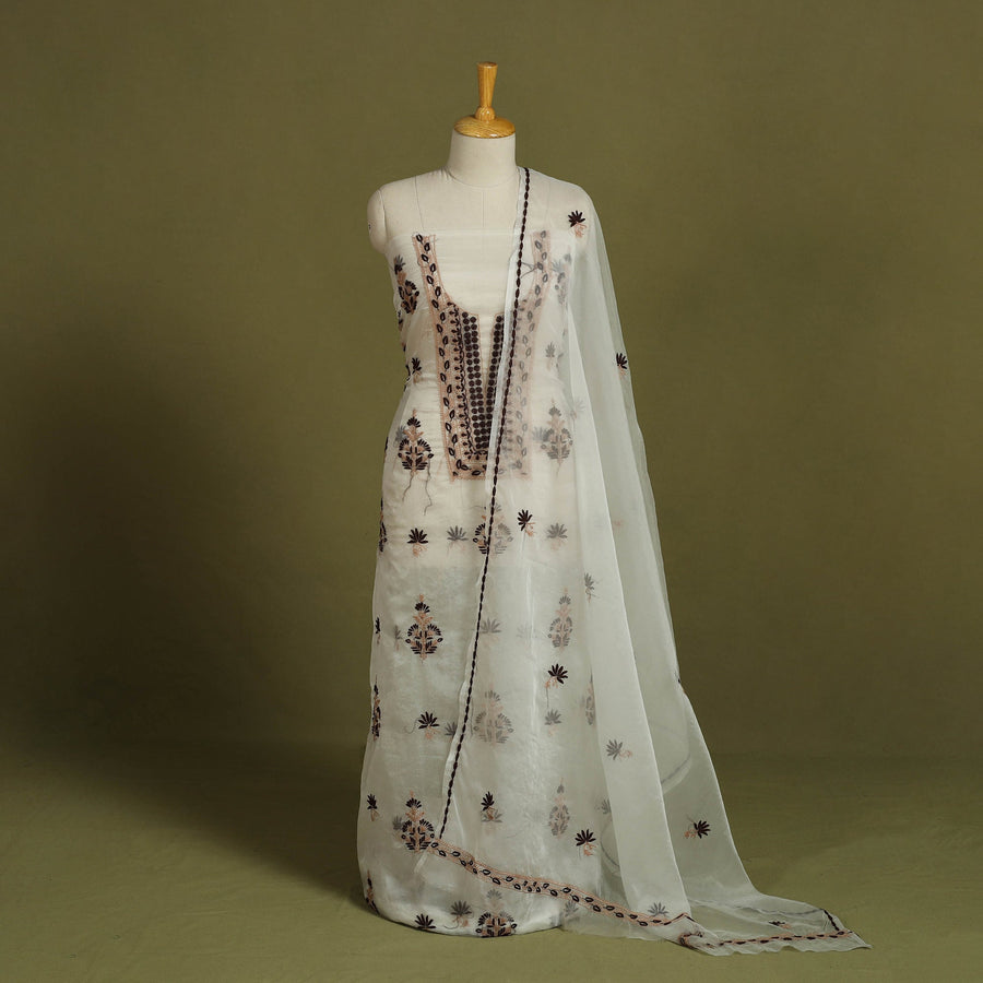 Intricate and artfully done white lucknowi chikankari hand embroidery chanderi silk handloom 2pc dress material. Chikankari, originating from Lucknow, is a delicate hand embroidery technique where threads are embroidered onto light cotton garments in cool, pastel shades. Chanderi silks are renowned for their gossamer appearance and amazing feel. This set includes for both a kurta materials and a dupatta.