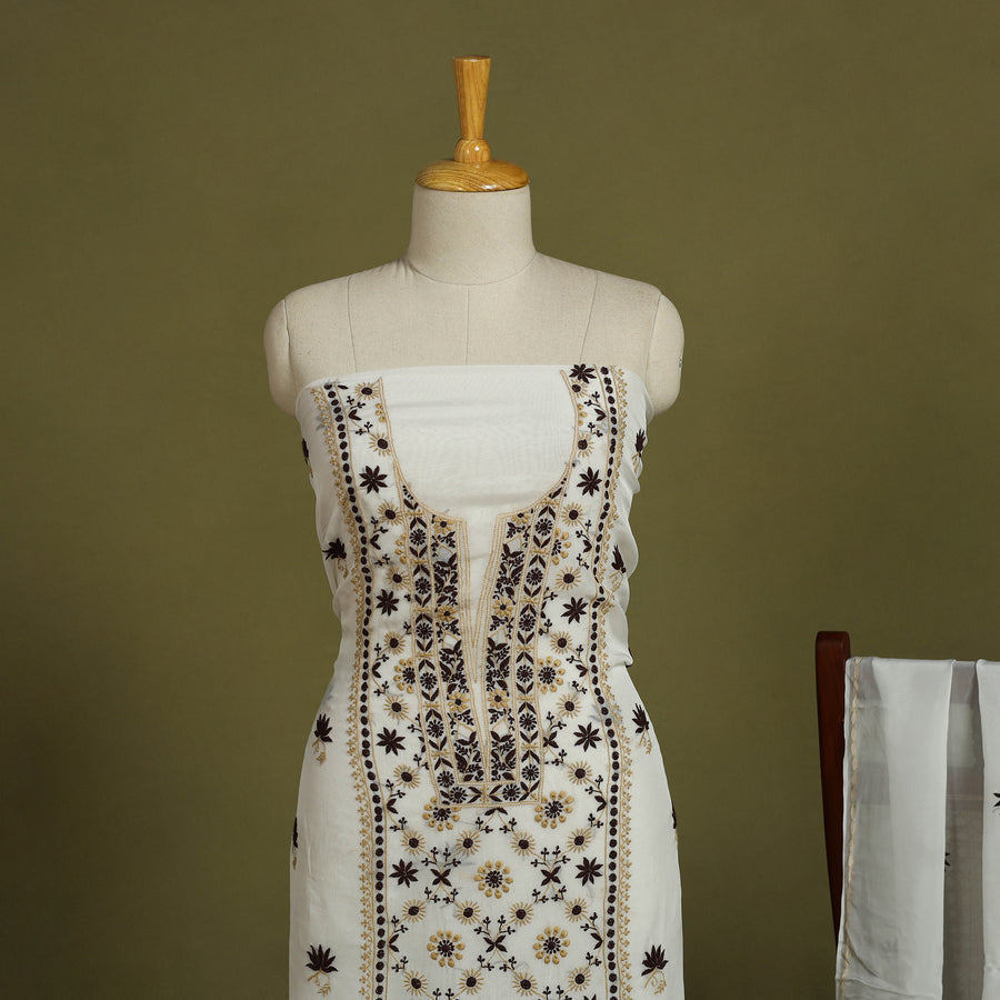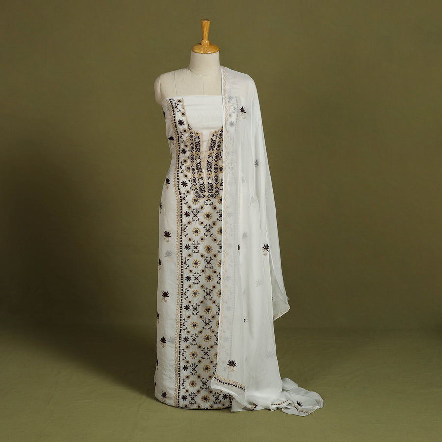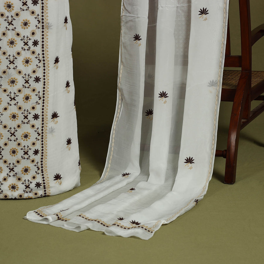 Intricate and artfully done white lucknowi chikankari hand embroidery chanderi silk handloom kurta material with dupatta. Chikankari is a traditional textile decorative from Lucknow. It is very delicate and intricate hand embroidery work where thread is embroidered on cool, pastel shades of light cotton garments. Chanderi silks are known for its gossamer looks and amazing feel.