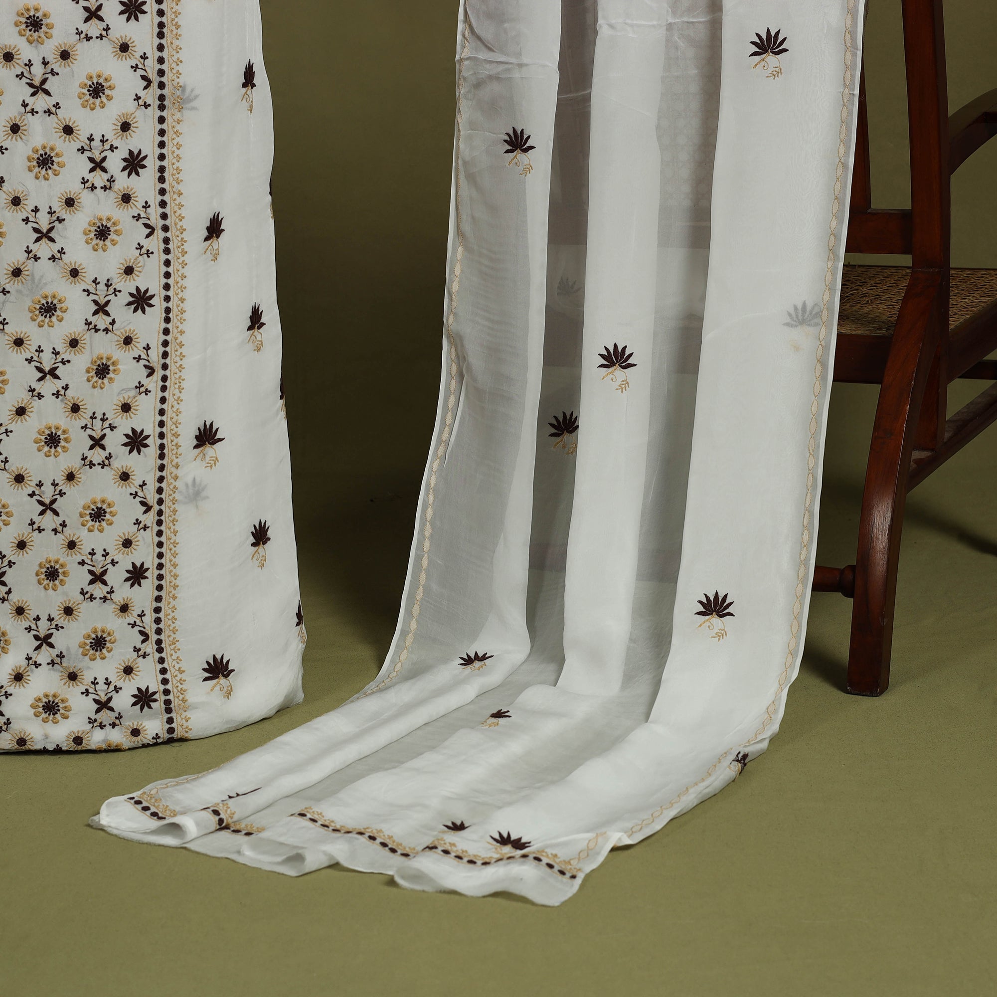 Chikankari is a popular embroidery work done with the help of a white cotton thread on fine white cotton material. It is also known as shadow work. Chikan is an extremely delicate and artfully done hand embroidery on fabrics like muslin, silk, chiffon, organza, net, etc