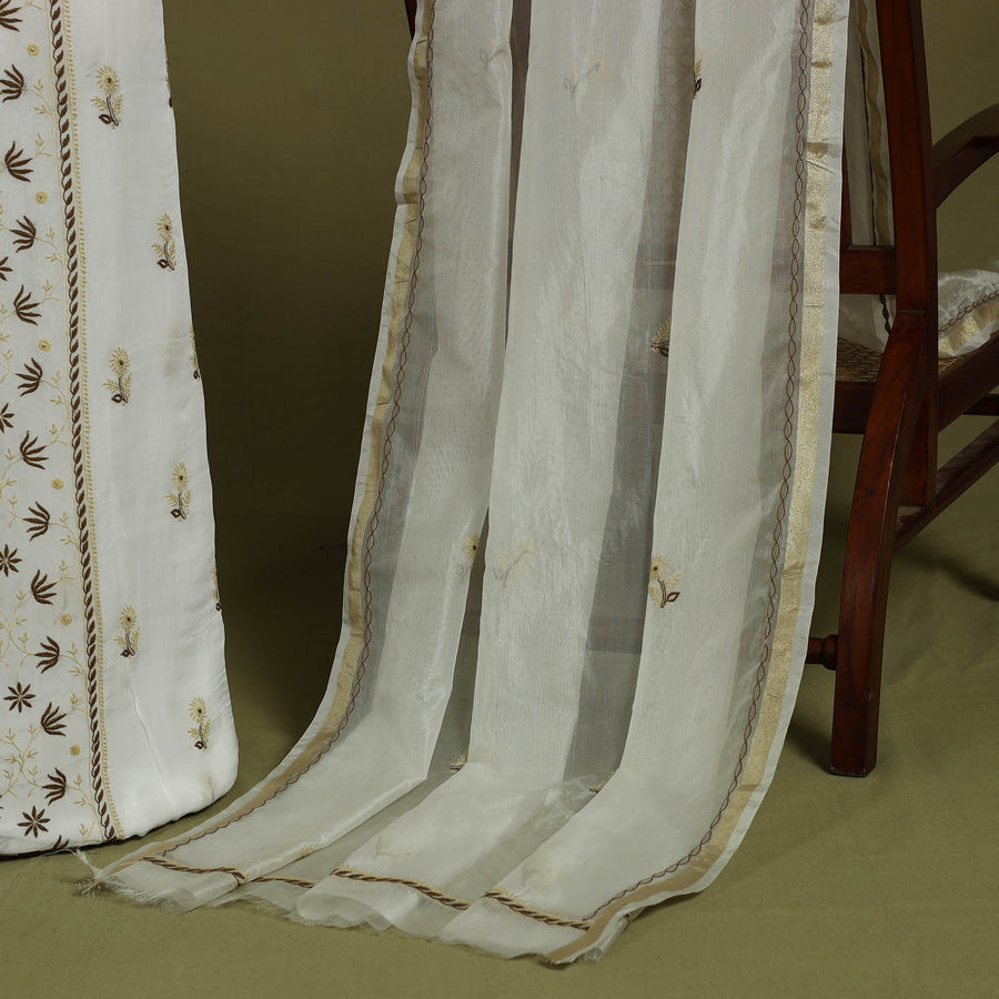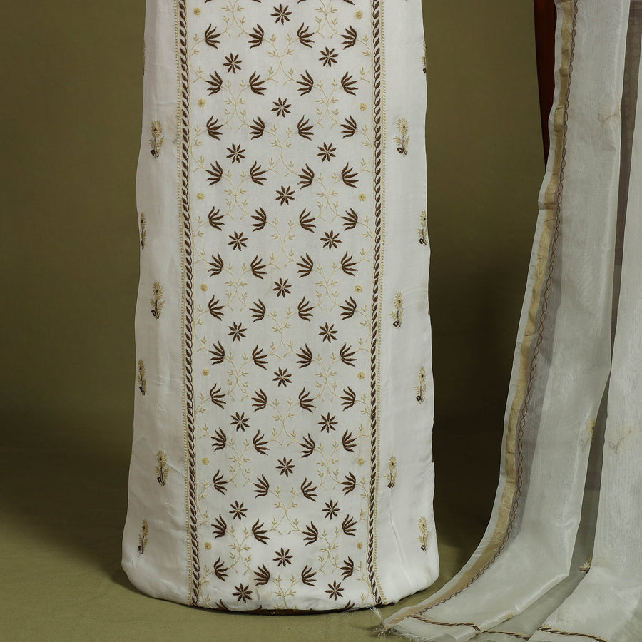 Intricate and artfully done white lucknowi chikankari hand embroidery chanderi silk handloom 2pc dress material. Chikankari, originating from Lucknow, is a delicate hand embroidery technique where threads are embroidered onto light cotton garments in cool, pastel shades. Chanderi silks are renowned for their gossamer appearance and amazing feel. This set includes for both a kurta materials and a dupatta.
