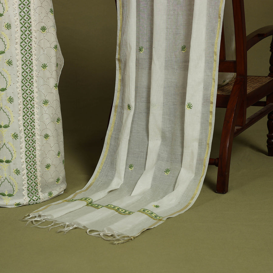 Intricate and artfully done white lucknowi chikankari hand embroidery chanderi silk handloom kurta material with dupatta. Chikankari is a traditional textile decorative from Lucknow. It is very delicate and intricate hand embroidery work where thread is embroidered on cool, pastel shades of light cotton garments. Chanderi silks are known for its gossamer looks and amazing feel.