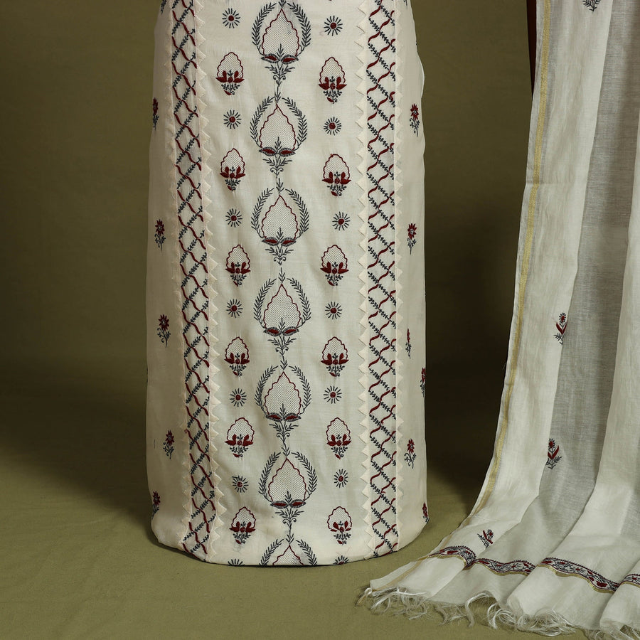 Intricate and artfully done white lucknowi chikankari hand embroidery chanderi silk handloom kurta material with dupatta. Chikankari is a traditional textile decorative from Lucknow. It is very delicate and intricate hand embroidery work where thread is embroidered on cool, pastel shades of light cotton garments. Chanderi silks are known for its gossamer looks and amazing feel.