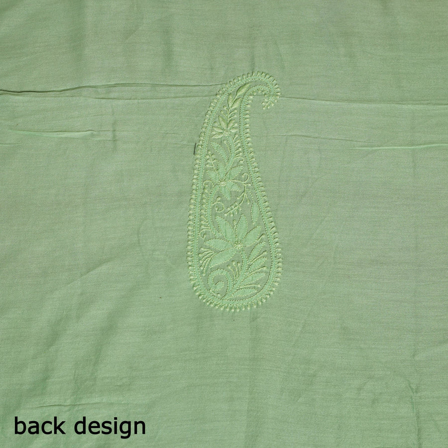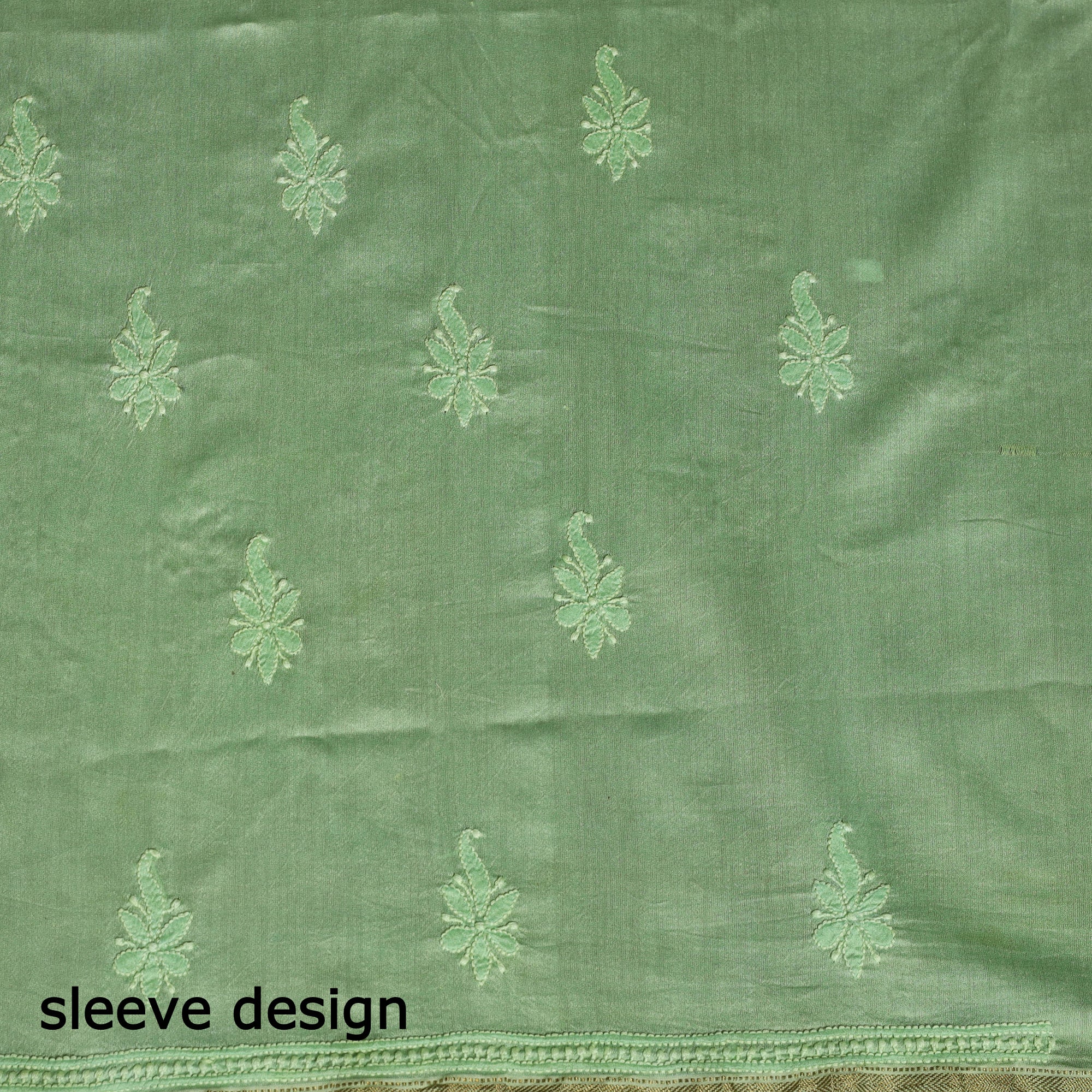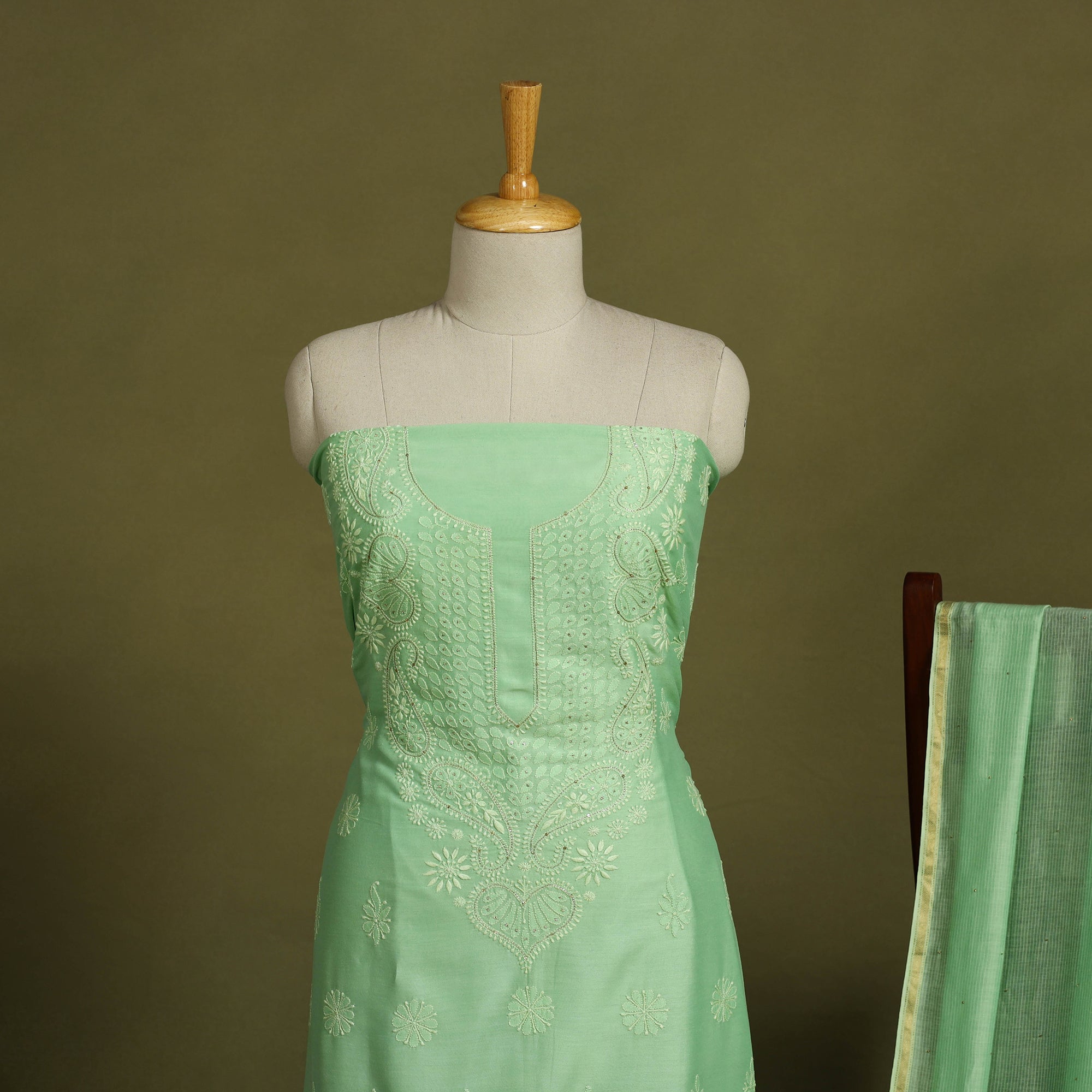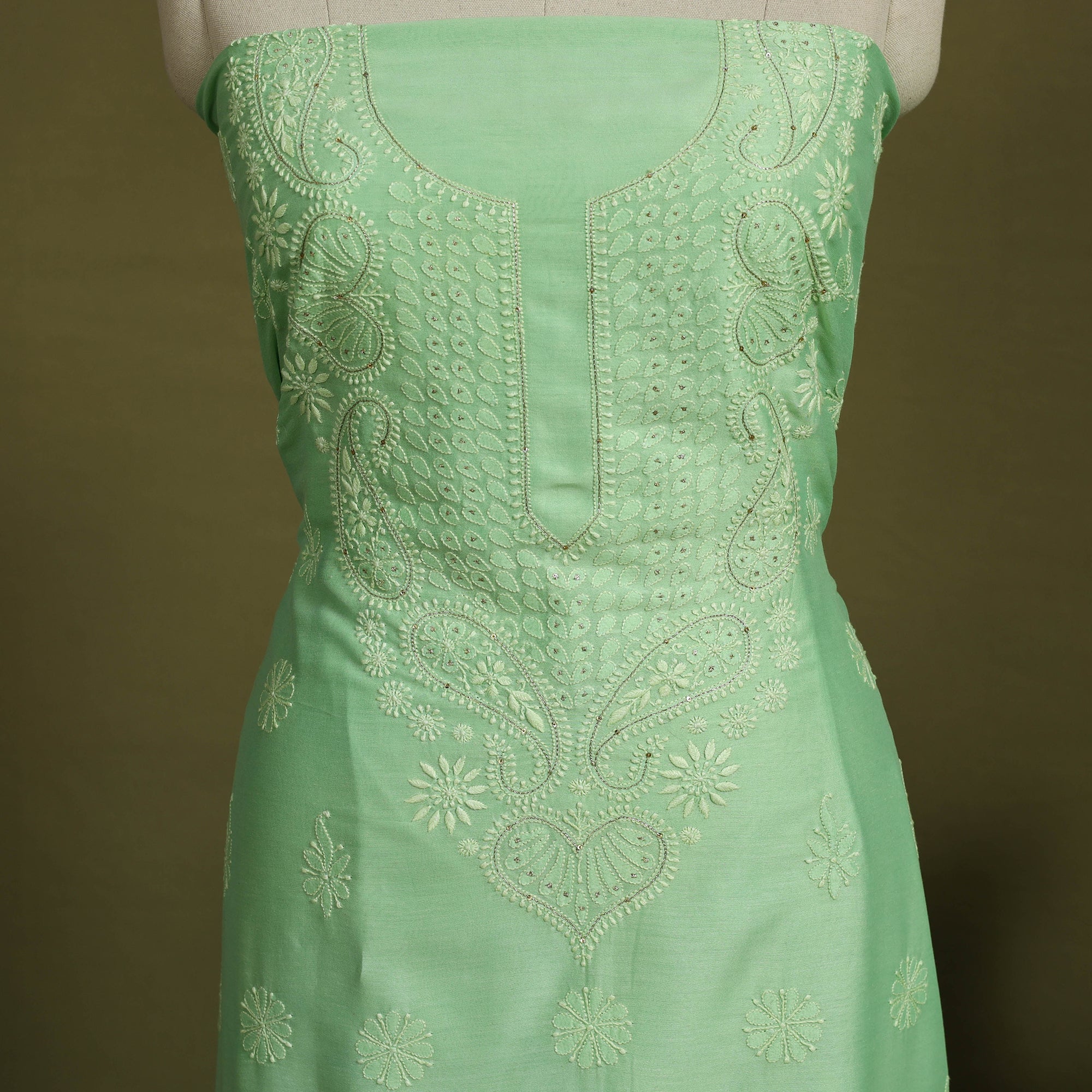 Intricate and artfully done special green lucknowi chikankari hand embroidery chanderi silk-cotton kurta material with zari & mukaish work dupatta. Chikankari is a traditional textile decorative from Lucknow. It is very delicate and intricate hand embroidery work where thread is embroidered on cool, pastel shades of light cotton garments. Chanderi silks are known for its gossamer looks and amazing feel.