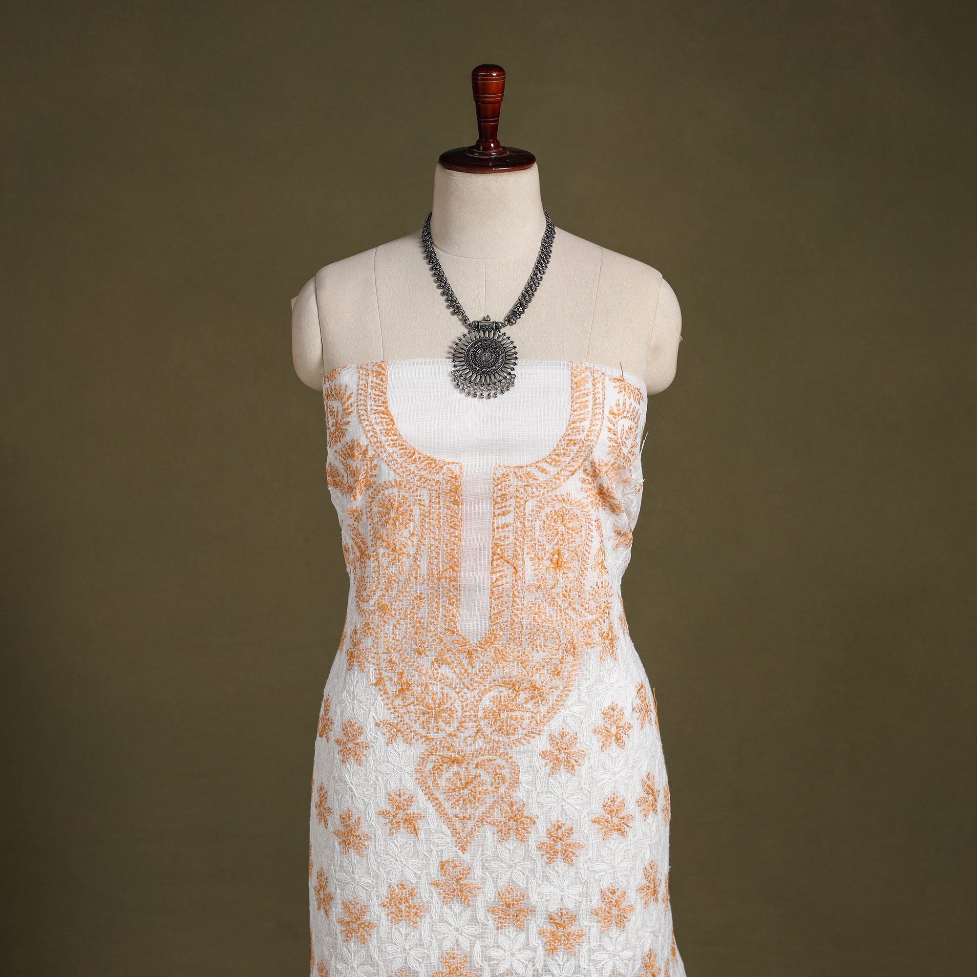 Intricate and artfully done peach lucknowi chikankari tepchi hand embroidery kota doria cotton kurta material. Chikankari is a traditional textile decorative from Lucknow. It is very delicate and intricate hand embroidery work where thread is embroidered on cool, pastel shades of light cotton garments.
