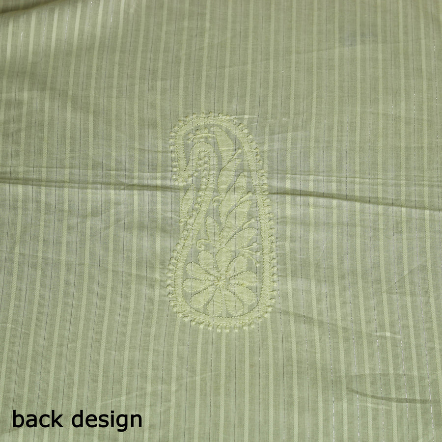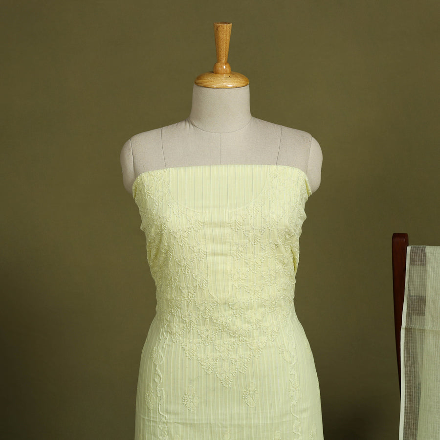 Intricate and artfully done yellow lucknowi chikankari hand embroidery cotton kurta material with kota doria cotton dupatta. Chikankari is a traditional textile decorative from Lucknow. It is very delicate and intricate hand embroidery work where thread is embroidered on cool, pastel shades of light cotton garments.