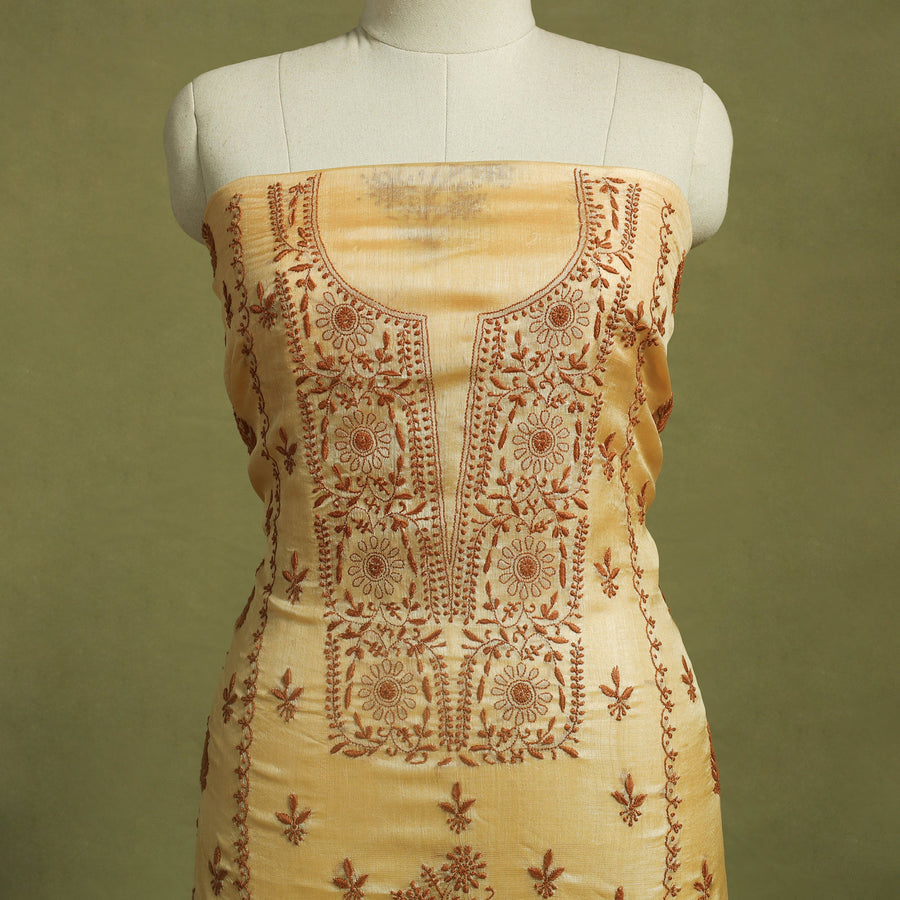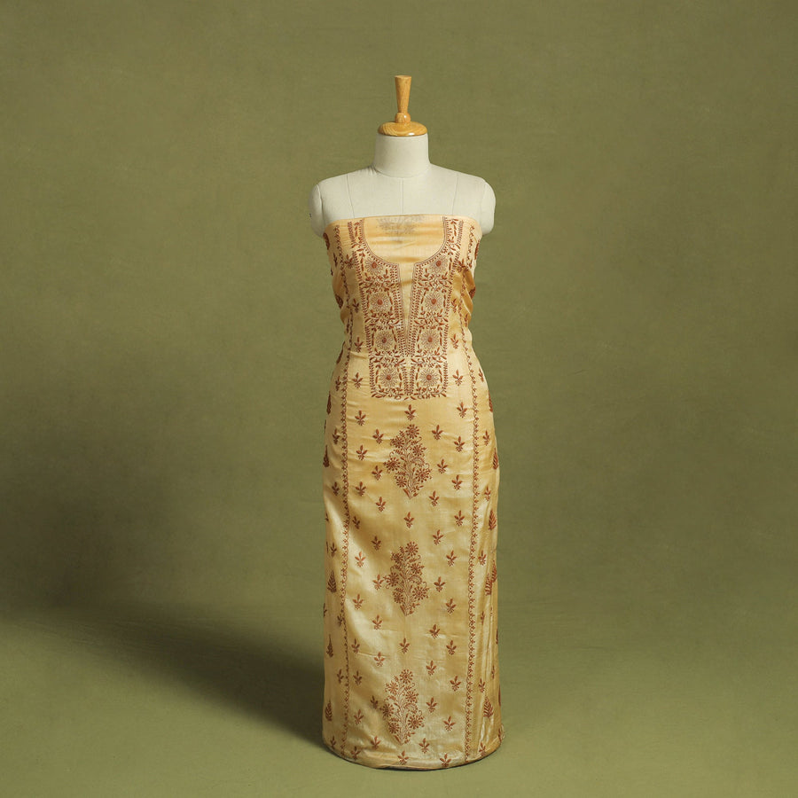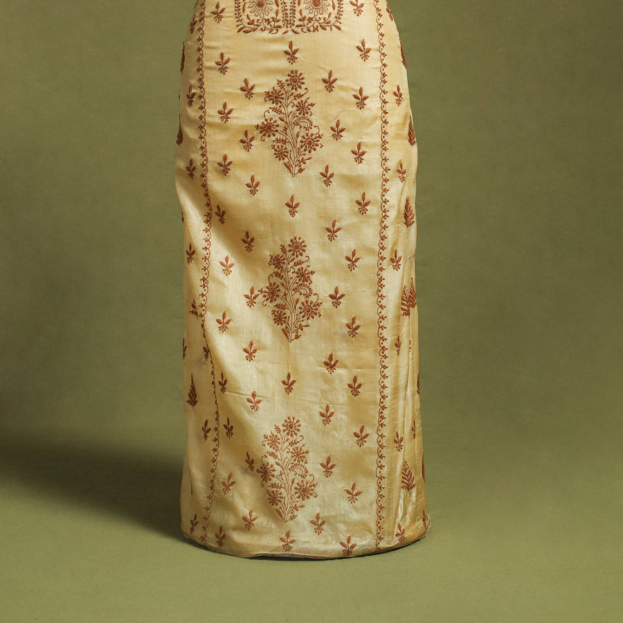 Intricate and artfully done beige lucknowi chikankari hand embroidery tussar silk handloom kurta material. Chikankari is a traditional textile decorative from Lucknow. It is very delicate and intricate hand embroidery work where thread is embroidered on cool, pastel shades of light cotton garments. Tussar silk is known for its unique texture, sheen of silk and feel of cotton A perfect blend of both worlds completely suitable for all weathers.