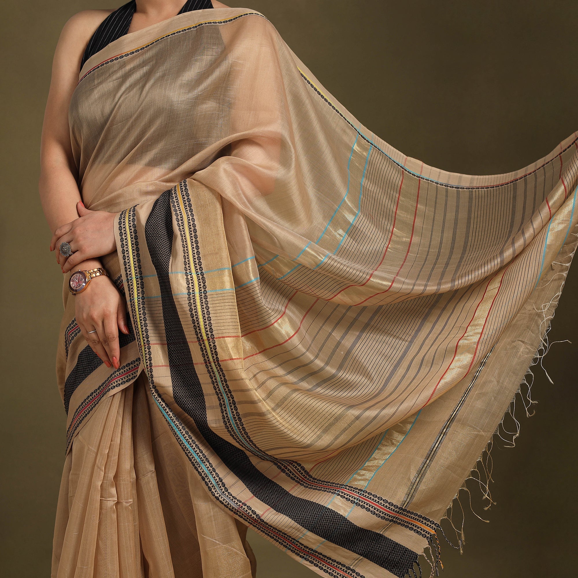 Traditional brown handloom zari work maheshwari silk saree by master-weaver Gulrez Ansari from Maheshwar. This saree silk-cotton blend, adorned with zari borders that exude timeless elegance. Lightweight and versatile, they are ideal for festive occasions and daily sophistication. Each saree reflects centuries-old weaving traditions.