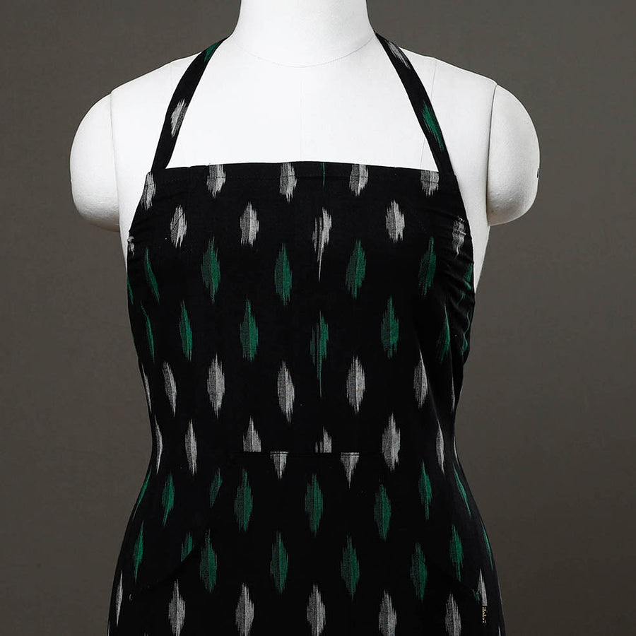 Between oil splatters, flour-covered counters, and food flying from the mixer, it's no secret that cooking can get messy. This black pochampally ikat cotton apron with pocket for easy-access storage is a must-have kitchen essential. The gorgeous prints on it will make you look stylish when you cook delicious food. Ikat (Ikkat) is a dyeing technique used to pattern textiles that employs a resist dyeing process similar to tie-dye on either the warp or weft fibers prior to dyeing.