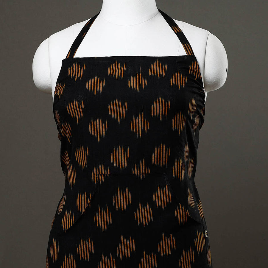 Between oil splatters, flour-covered counters, and food flying from the mixer, it's no secret that cooking can get messy. This black pochampally ikat cotton apron with pocket for easy-access storage is a must-have kitchen essential. The gorgeous prints on it will make you look stylish when you cook delicious food. Ikat (Ikkat) is a dyeing technique used to pattern textiles that employs a resist dyeing process similar to tie-dye on either the warp or weft fibers prior to dyeing.