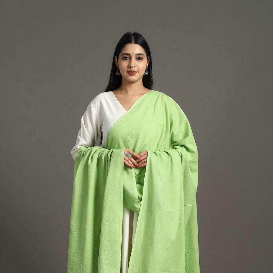 Elevate your ethnic style with our exquisite green Lucknow Chikankari Hand Embroidered Cotton Dupatta. This dupatta is a masterpiece of intricate and artful chikankari hand embroidery, a traditional textile decorative art form from Lucknow. Delicate threads are meticulously embroidered on cool, pastel shades of light cotton fabric, creating a mesmerizing effect. The fine detailing and intricate stitches showcase the timeless charm of chikankari, known for its delicate beauty and craftsmanship. This cotton dupatta is perfect for adding a touch of elegance to any ethnic outfit. Whether draped over a kurta, paired with a salwar suit, it is sure to enhance your style quotient. The softness and comfort of cotton fabric make it a joy to wear, while the ethereal beauty of chikankari hand embroidery adds a touch of sophistication to your look.