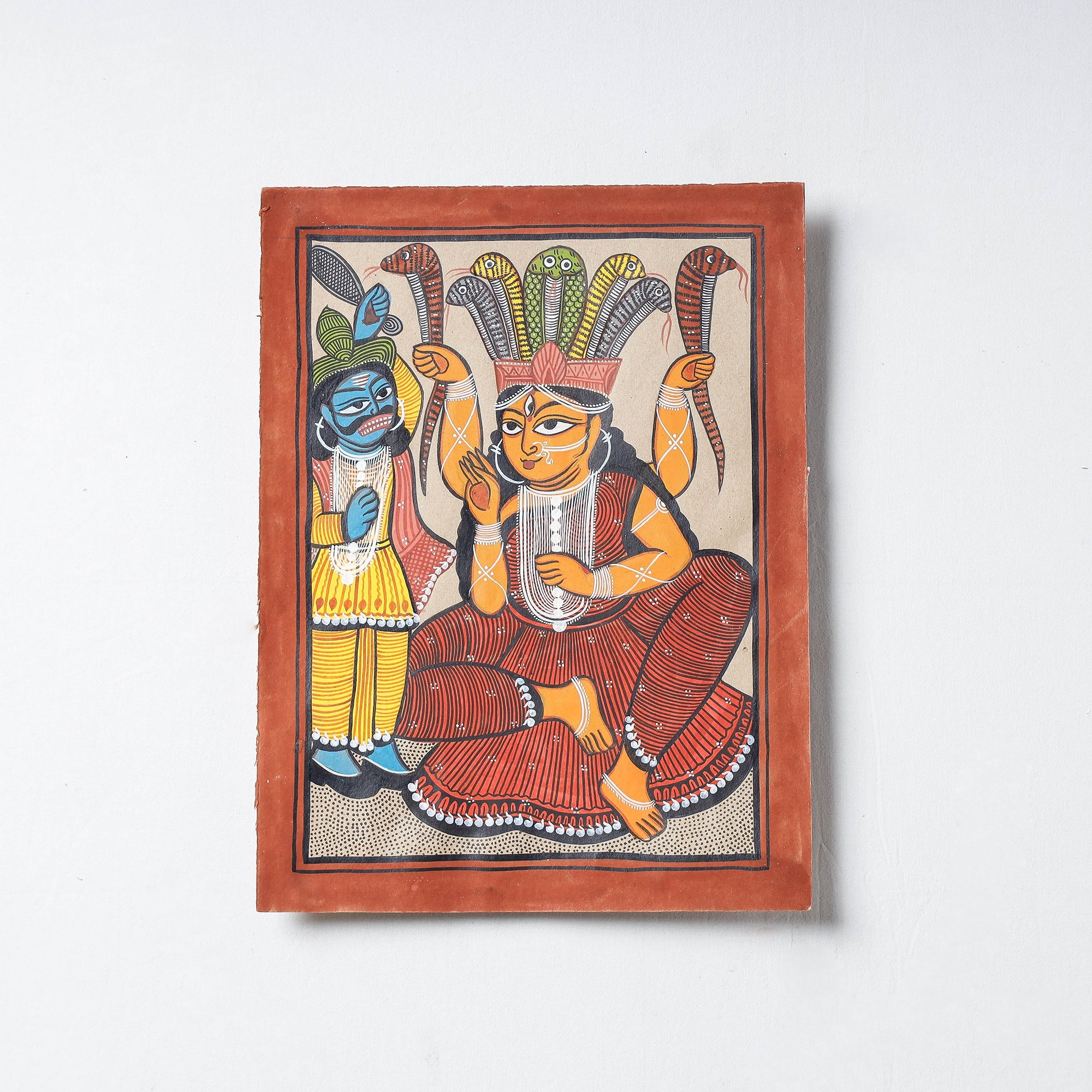 This hand-painted patua painting is a unique piece of traditional art, featuring vegetable dyes and art paper. The patua art form originated in Bengal in the 19th century near the Kali temples of Kolkata, and this piece provides a glimpse into the region's history and culture. Patuas were wandering scroll painters who settled in the area and depicted gods, goddesses, and contemporary life with a touch of humor. A perfect addition for art connoisseurs and decor enthusiasts, these paintings are priceless collectibles.