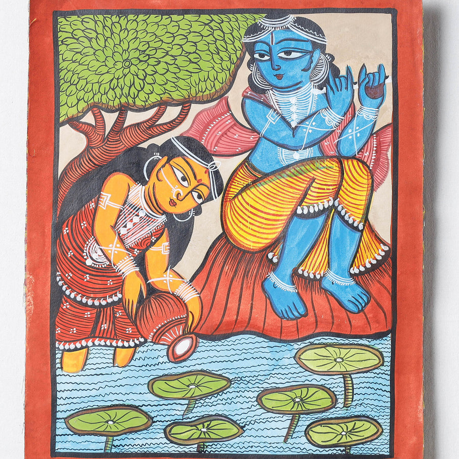 This hand-painted patua painting is a unique piece of traditional art, featuring vegetable dyes and art paper. The patua art form originated in Bengal in the 19th century near the Kali temples of Kolkata, and this piece provides a glimpse into the region's history and culture. Patuas were wandering scroll painters who settled in the area and depicted gods, goddesses, and contemporary life with a touch of humor. A perfect addition for art connoisseurs and decor enthusiasts, these paintings are priceless collectibles.