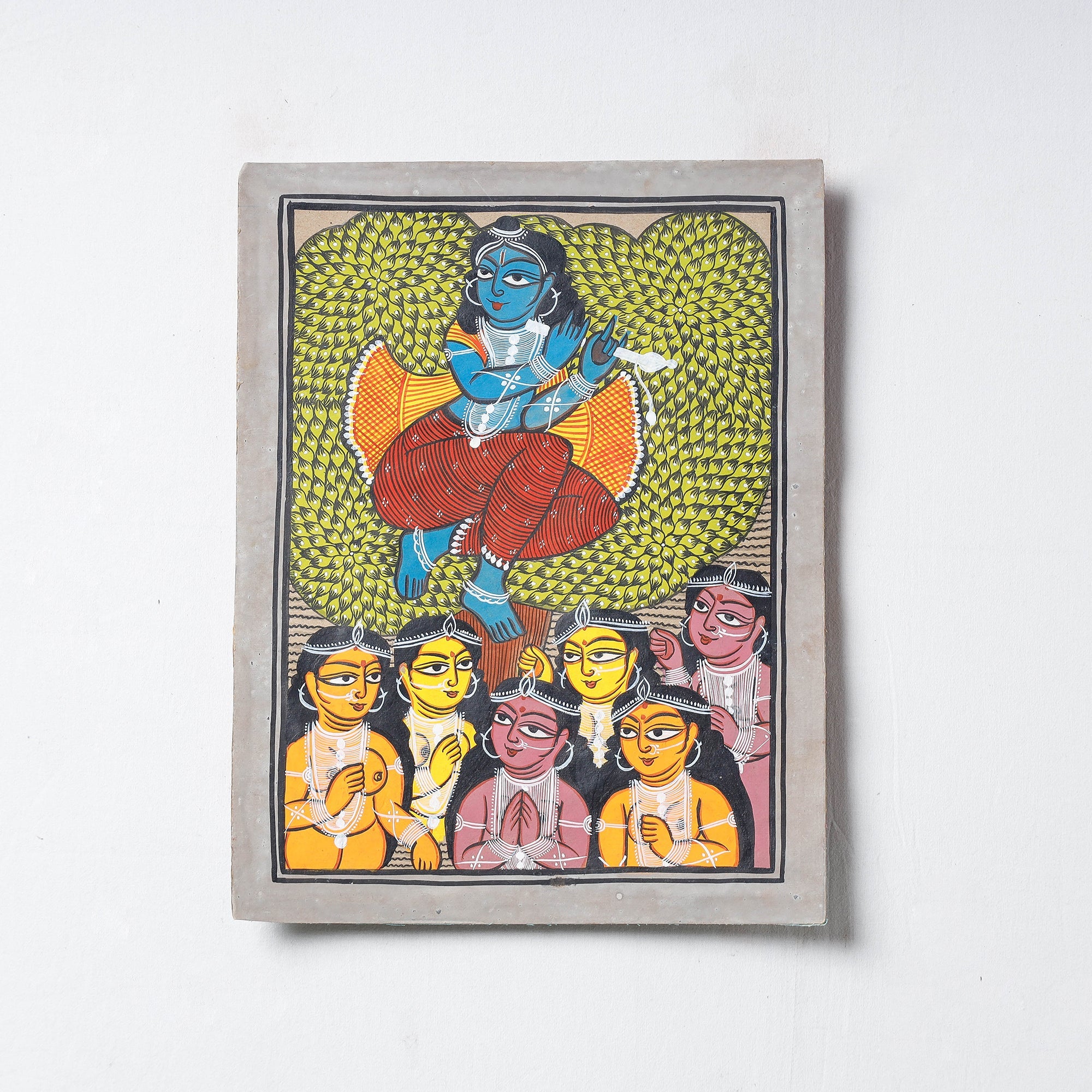 This hand-painted patua painting is a unique piece of traditional art, featuring vegetable dyes and art paper. The patua art form originated in Bengal in the 19th century near the Kali temples of Kolkata, and this piece provides a glimpse into the region's history and culture. Patuas were wandering scroll painters who settled in the area and depicted gods, goddesses, and contemporary life with a touch of humor. A perfect addition for art connoisseurs and decor enthusiasts, these paintings are priceless collectibles.