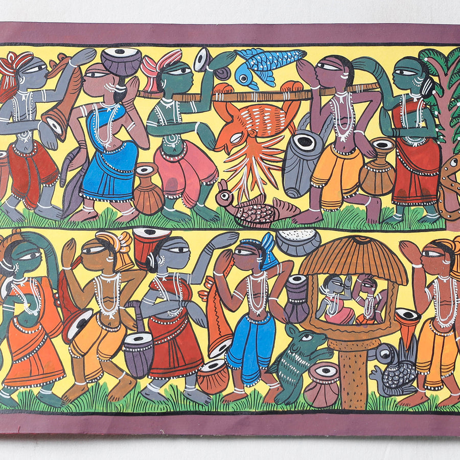 This hand-painted patua painting is a unique piece of traditional art, featuring vegetable dyes and art paper. The patua art form originated in Bengal in the 19th century near the Kali temples of Kolkata, and this piece provides a glimpse into the region's history and culture. Patuas were wandering scroll painters who settled in the area and depicted gods, goddesses, and contemporary life with a touch of humor. A perfect addition for art connoisseurs and decor enthusiasts, these paintings are priceless collectibles.