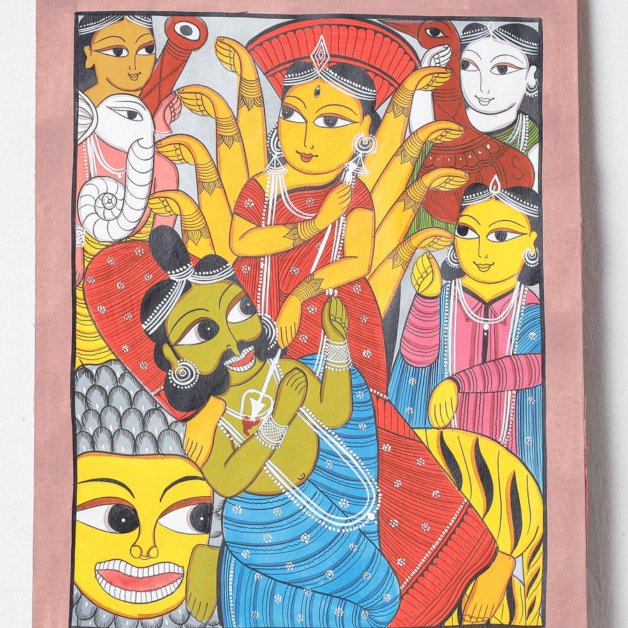This hand-painted patua painting is a unique piece of traditional art, featuring vegetable dyes and art paper. The patua art form originated in Bengal in the 19th century near the Kali temples of Kolkata, and this piece provides a glimpse into the region's history and culture. Patuas were wandering scroll painters who settled in the area and depicted gods, goddesses, and contemporary life with a touch of humor. A perfect addition for art connoisseurs and decor enthusiasts, these paintings are priceless collectibles.