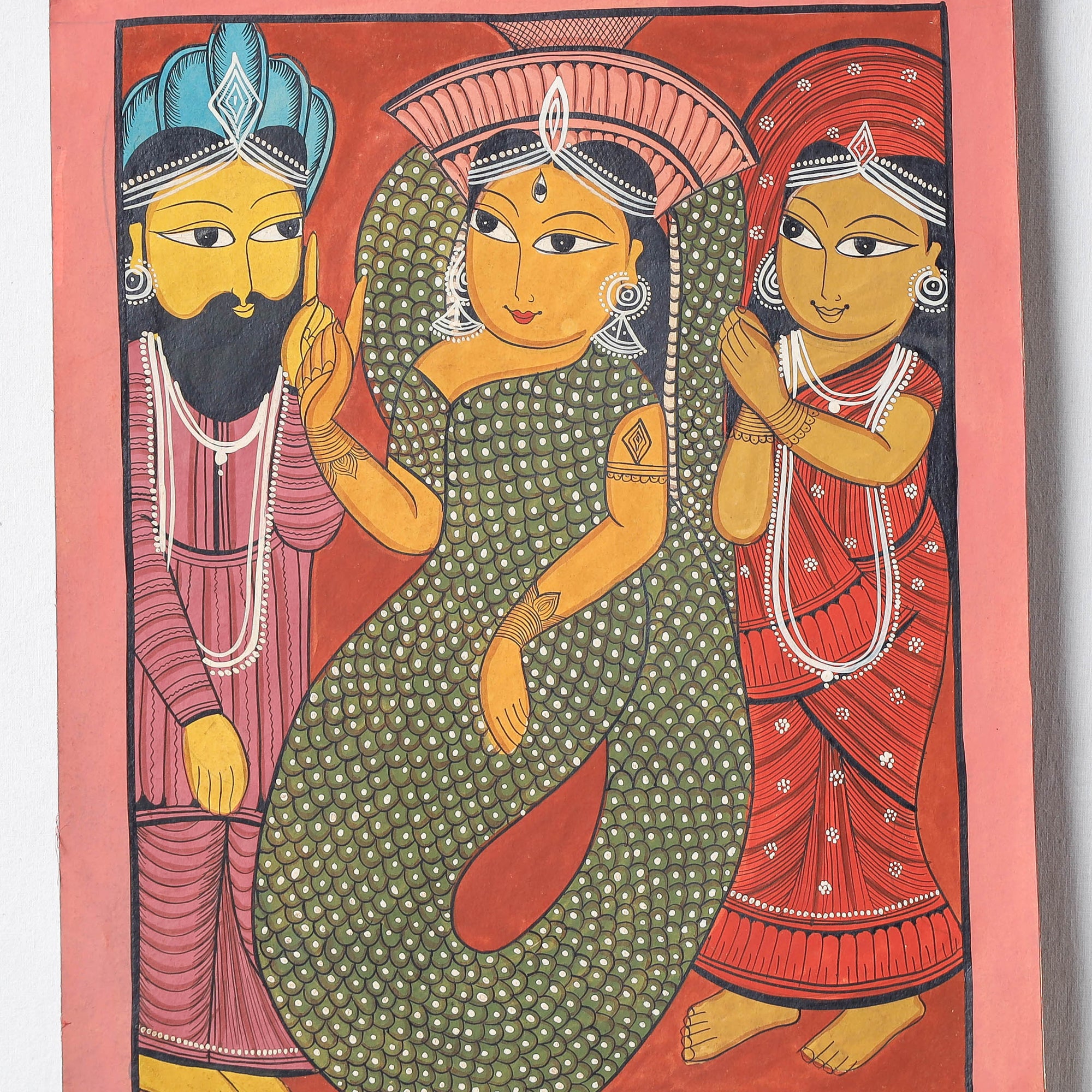 This hand-painted patua painting is a unique piece of traditional art, featuring vegetable dyes and art paper. The patua art form originated in Bengal in the 19th century near the Kali temples of Kolkata, and this piece provides a glimpse into the region's history and culture. Patuas were wandering scroll painters who settled in the area and depicted gods, goddesses, and contemporary life with a touch of humor. A perfect addition for art connoisseurs and decor enthusiasts, these paintings are priceless collectibles.