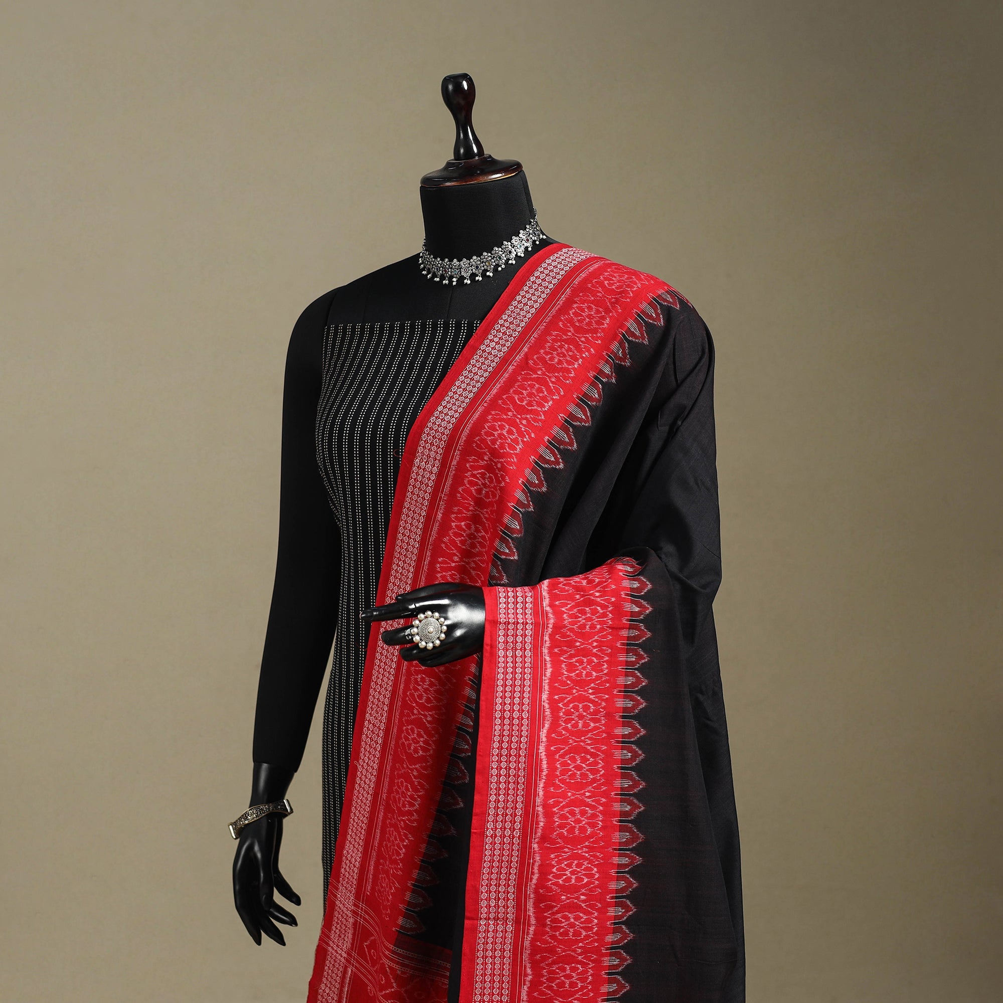 Black sambalpuri ikat weave handloom cotton dupatta from Odisha. Handcrafted by master artisans, this dupatta showcases the artistry of eastern India. Ikat, a dyeing technique known for its stunning patterns and vibrant colors, adds a touch of elegance to this piece. Embrace the beauty of Indian ikat, cherished by fashion designers worldwide.
