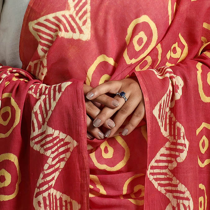 Fine quality red bagru dabu hand block printed mul cotton dupatta made using natural dyes through traditional mud resist process by using hand carved wooden block practiced in Bagru, Rajasthan.