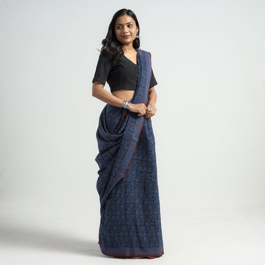 Experience the elegance of a blue Bagh block-printed cotton saree. Created by master artisan yakoob Khatri, this exquisite piece showcases intricate motifs and vibrant colours achieved through traditional hand block printing. Made with natural dyes, it embodies the rich cultural heritage of Bagh, in the Dhar district of Madhya Pradesh.