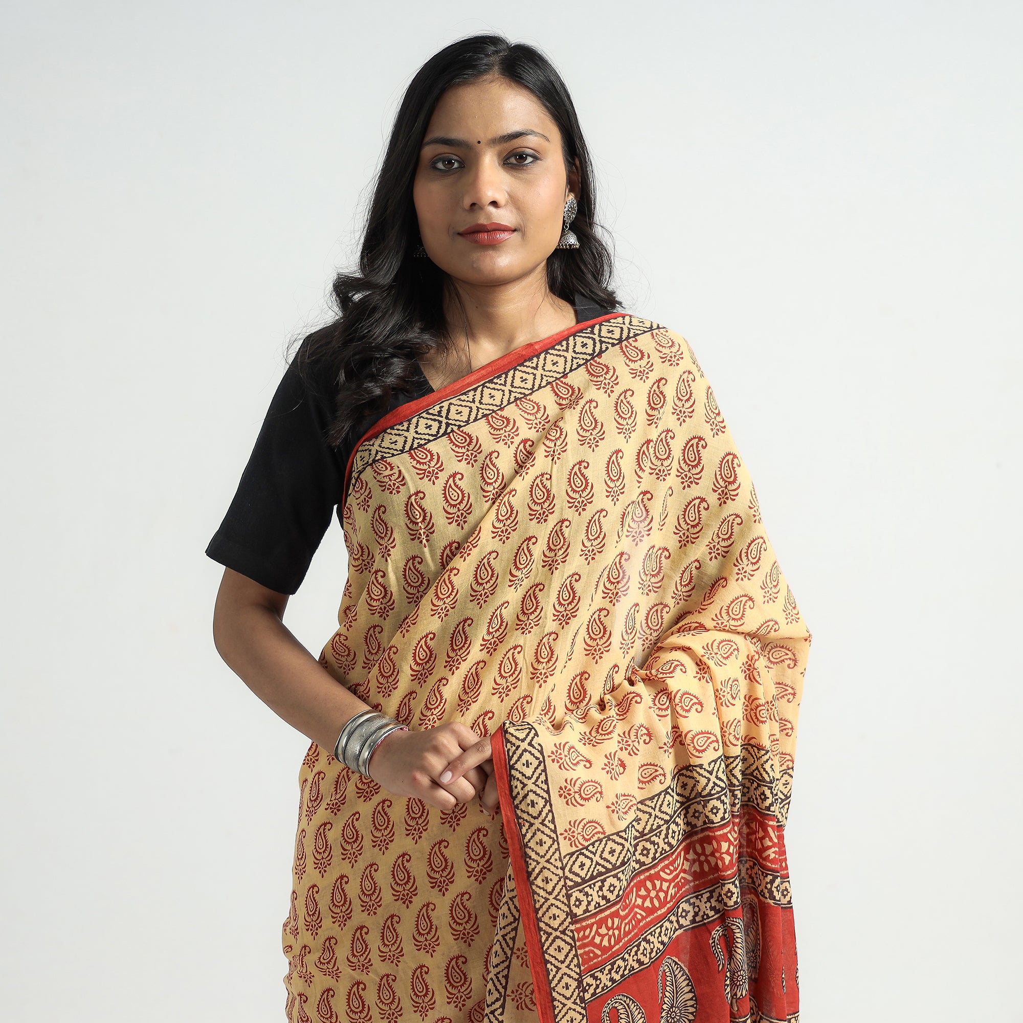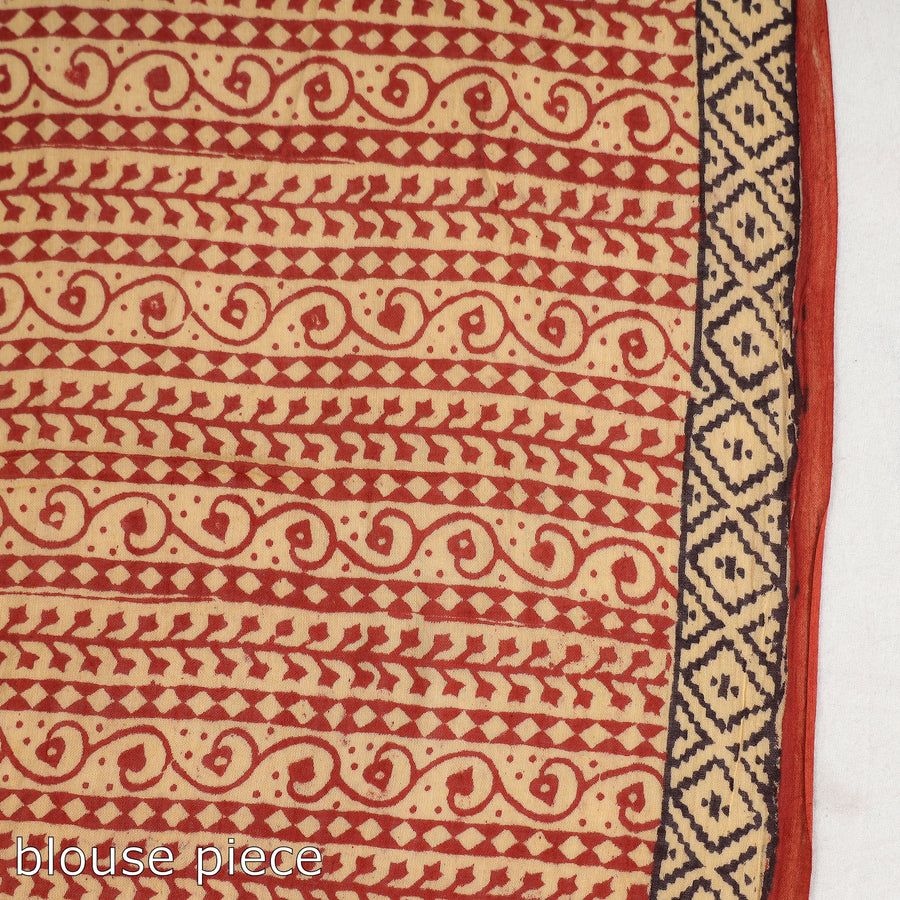 Experience the elegance of a beige Bagh block-printed cotton saree. Created by master artisan yakoob Khatri, this exquisite piece showcases intricate motifs and vibrant colours achieved through traditional hand block printing. Made with natural dyes, it embodies the rich cultural heritage of Bagh, in the Dhar district of Madhya Pradesh.