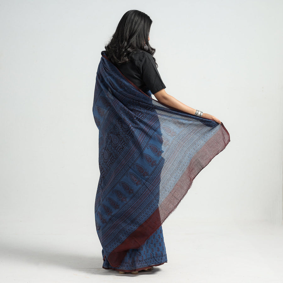 Experience the elegance of a blue Bagh block-printed cotton saree. Created by master artisan yakoob Khatri, this exquisite piece showcases intricate motifs and vibrant colours achieved through traditional hand block printing. Made with natural dyes, it embodies the rich cultural heritage of Bagh, in the Dhar district of Madhya Pradesh.