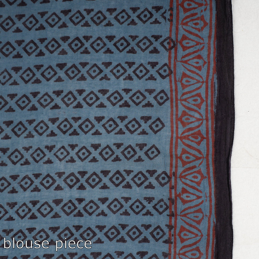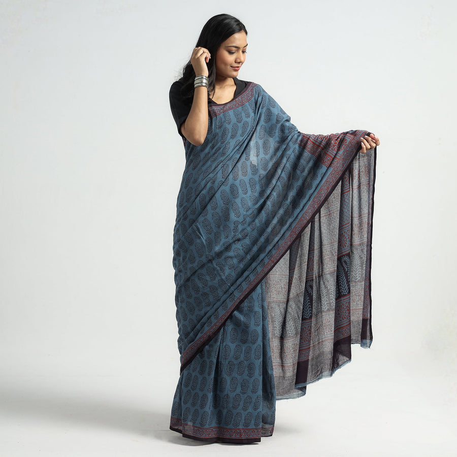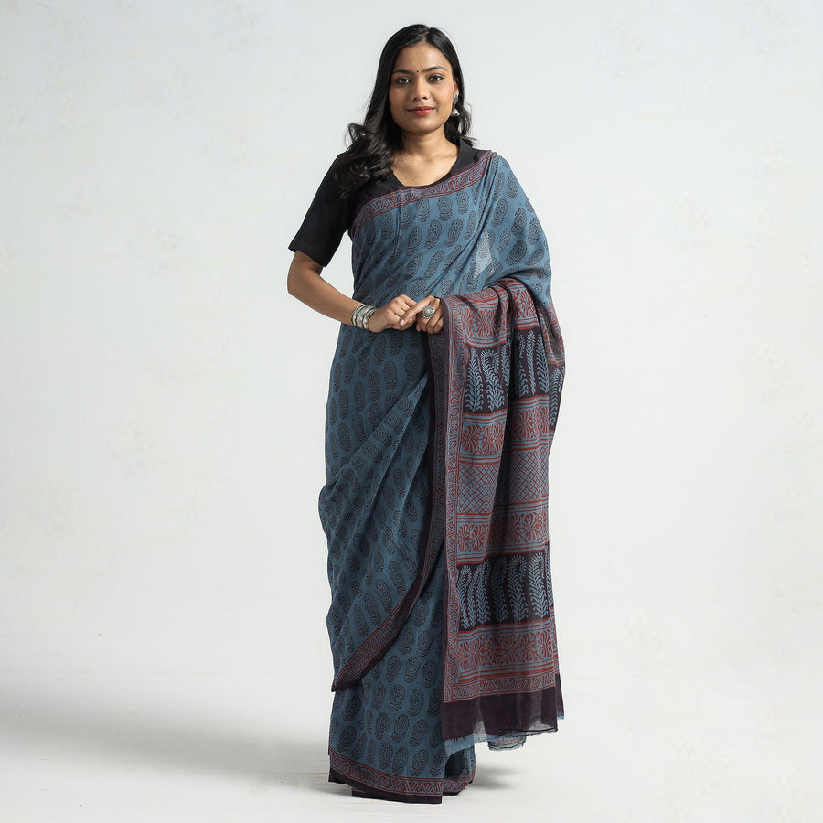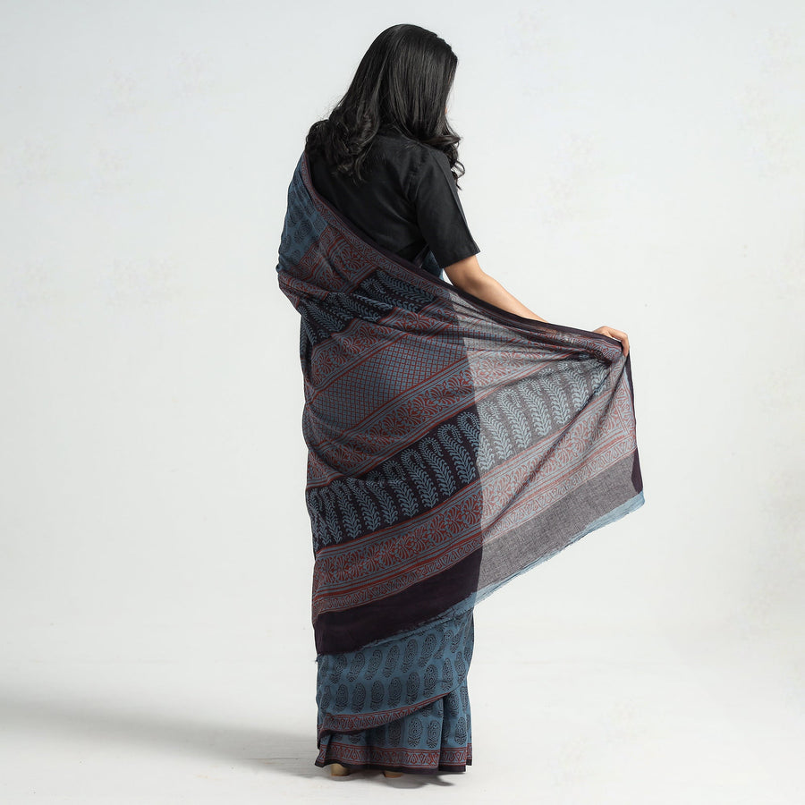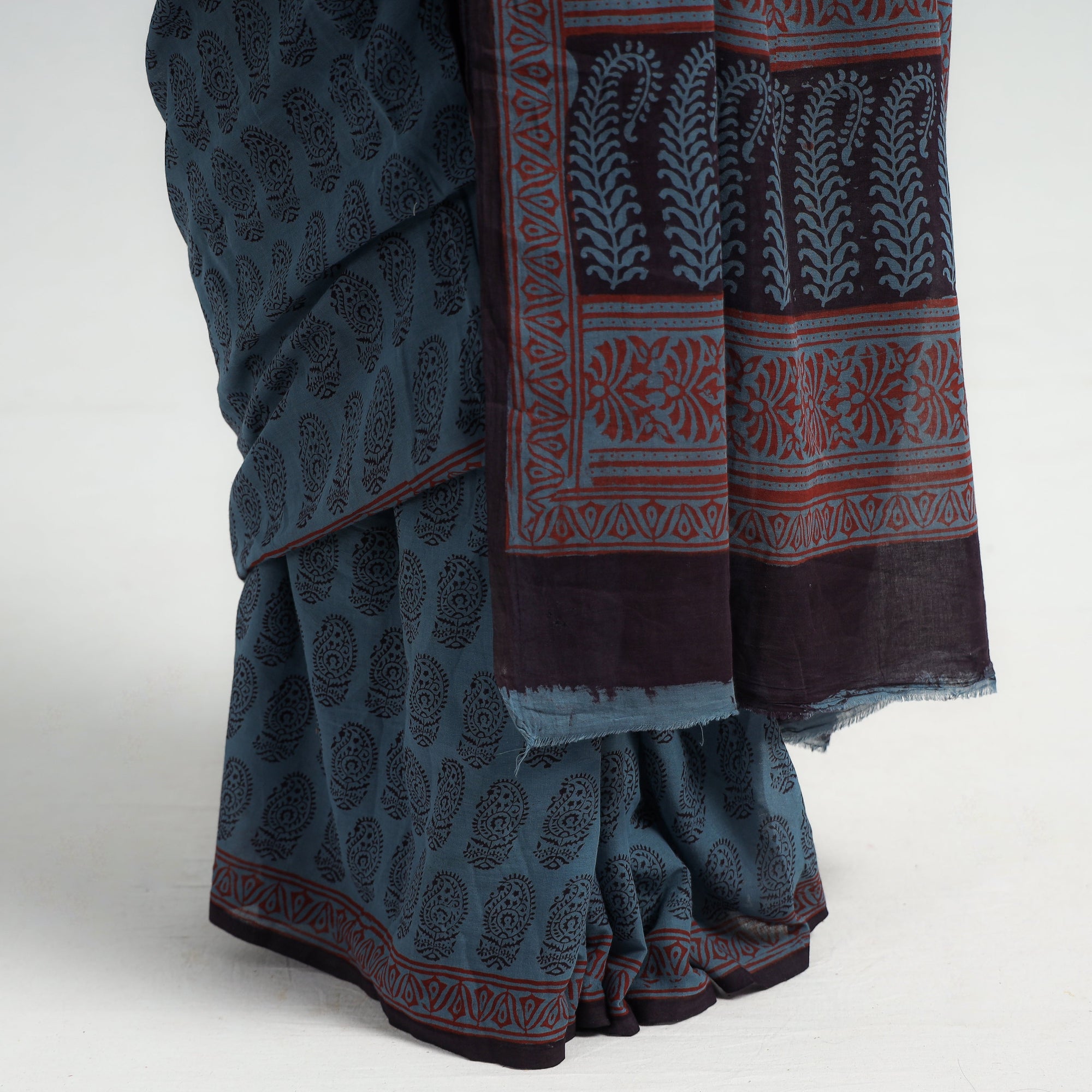 Experience the elegance of a blue Bagh block-printed cotton saree. Created by master artisan yakoob Khatri, this exquisite piece showcases intricate motifs and vibrant colours achieved through traditional hand block printing. Made with natural dyes, it embodies the rich cultural heritage of Bagh, in the Dhar district of Madhya Pradesh.