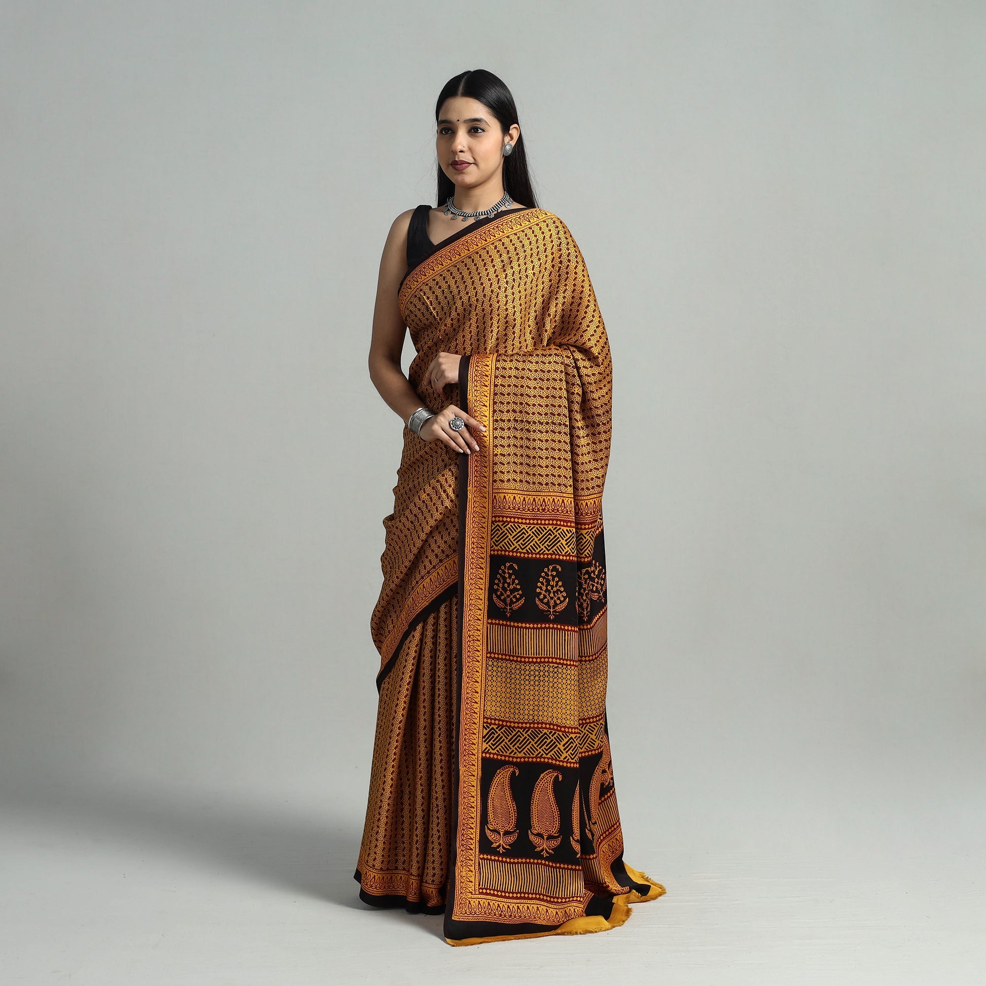 Fine quality yellow bagh block printed modal silk saree, made using traditional process of hand block printing by Mohammed Rafik Khatri practiced in Bagh, the Dhar district of Madhya Pradesh. natrual dyes have been used to make this saree. Modal silk is a soft, shiny and highly lustrous fabric, achieved through interlacing modal fibers and silk yarns. it has opulence of silk and the comfort of cotton modal is a fine and soft textured weave.