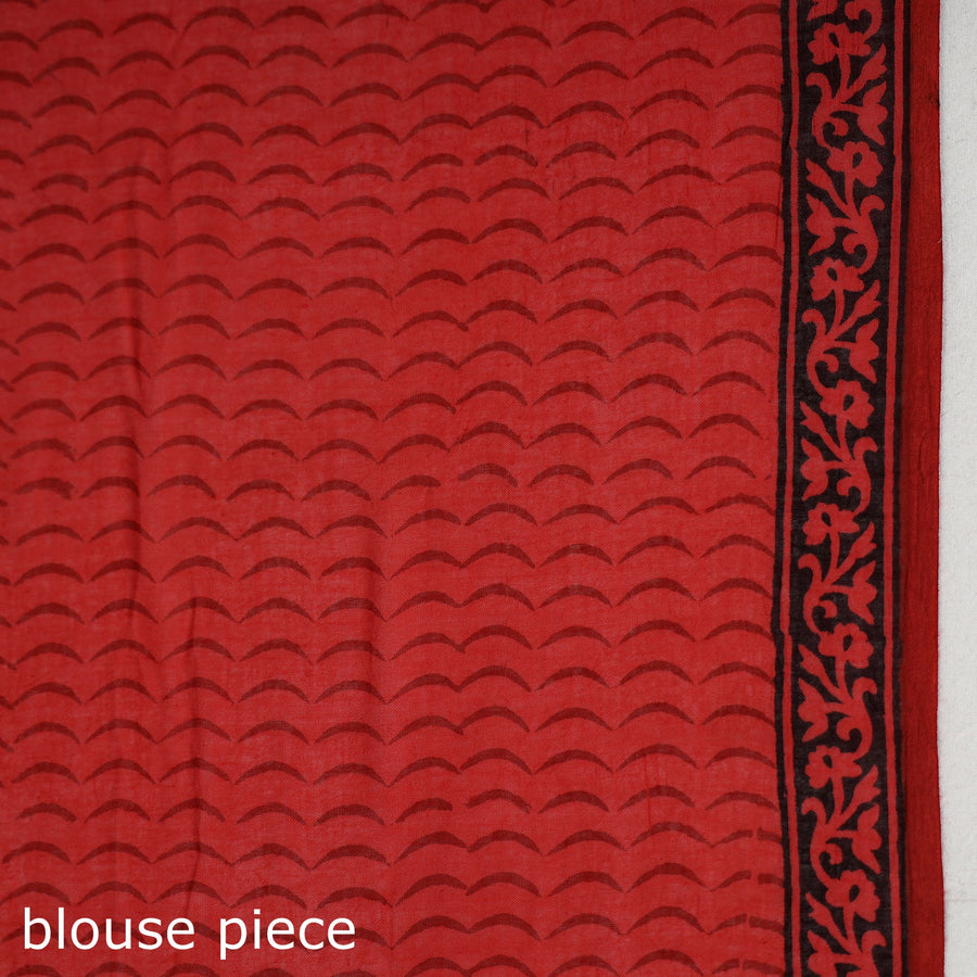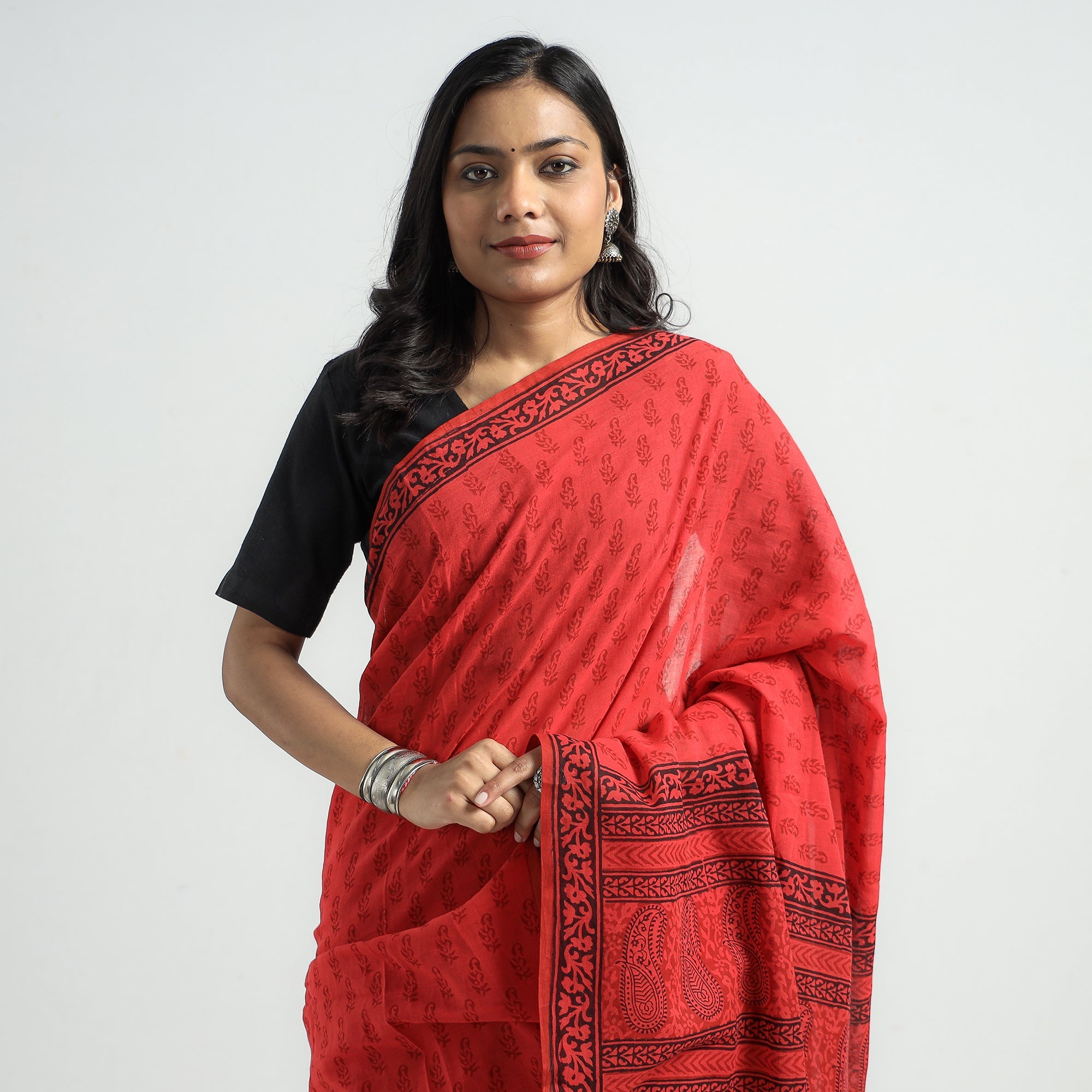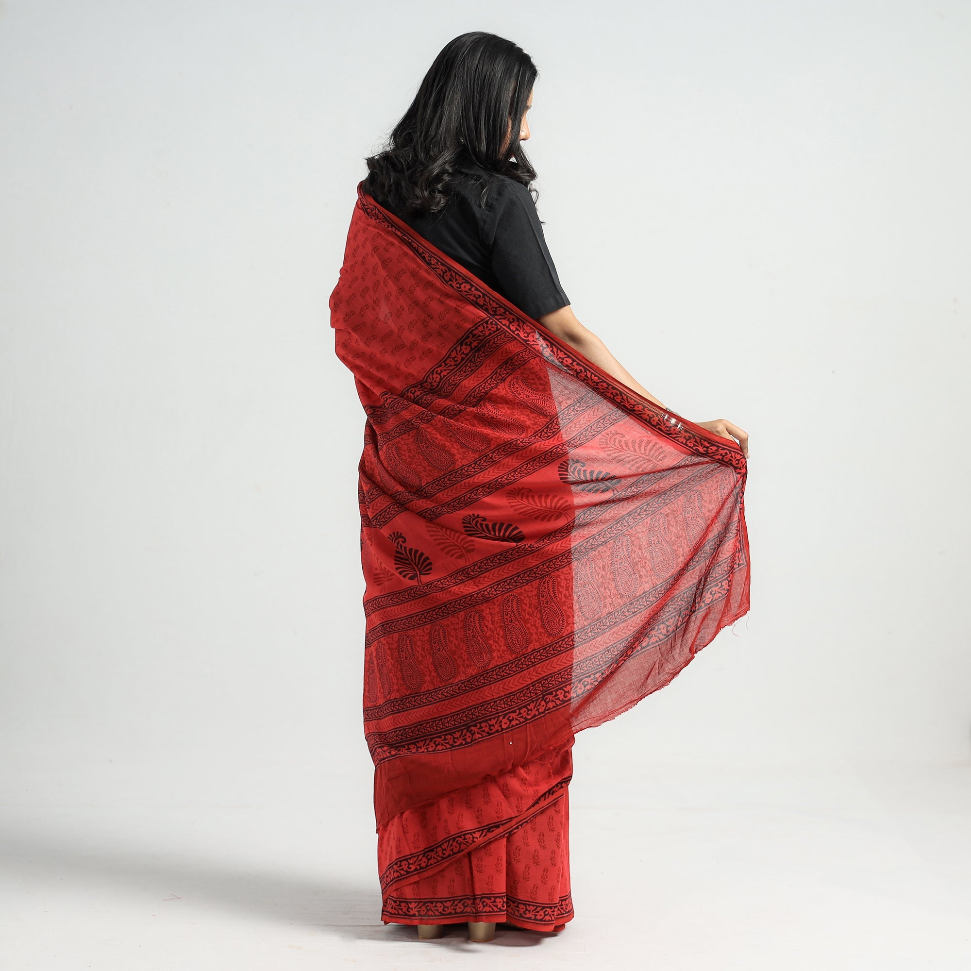 Experience the elegance of a red Bagh block-printed cotton saree. Created by master artisan yakoob Khatri, this exquisite piece showcases intricate motifs and vibrant colours achieved through traditional hand block printing. Made with natural dyes, it embodies the rich cultural heritage of Bagh, in the Dhar district of Madhya Pradesh.