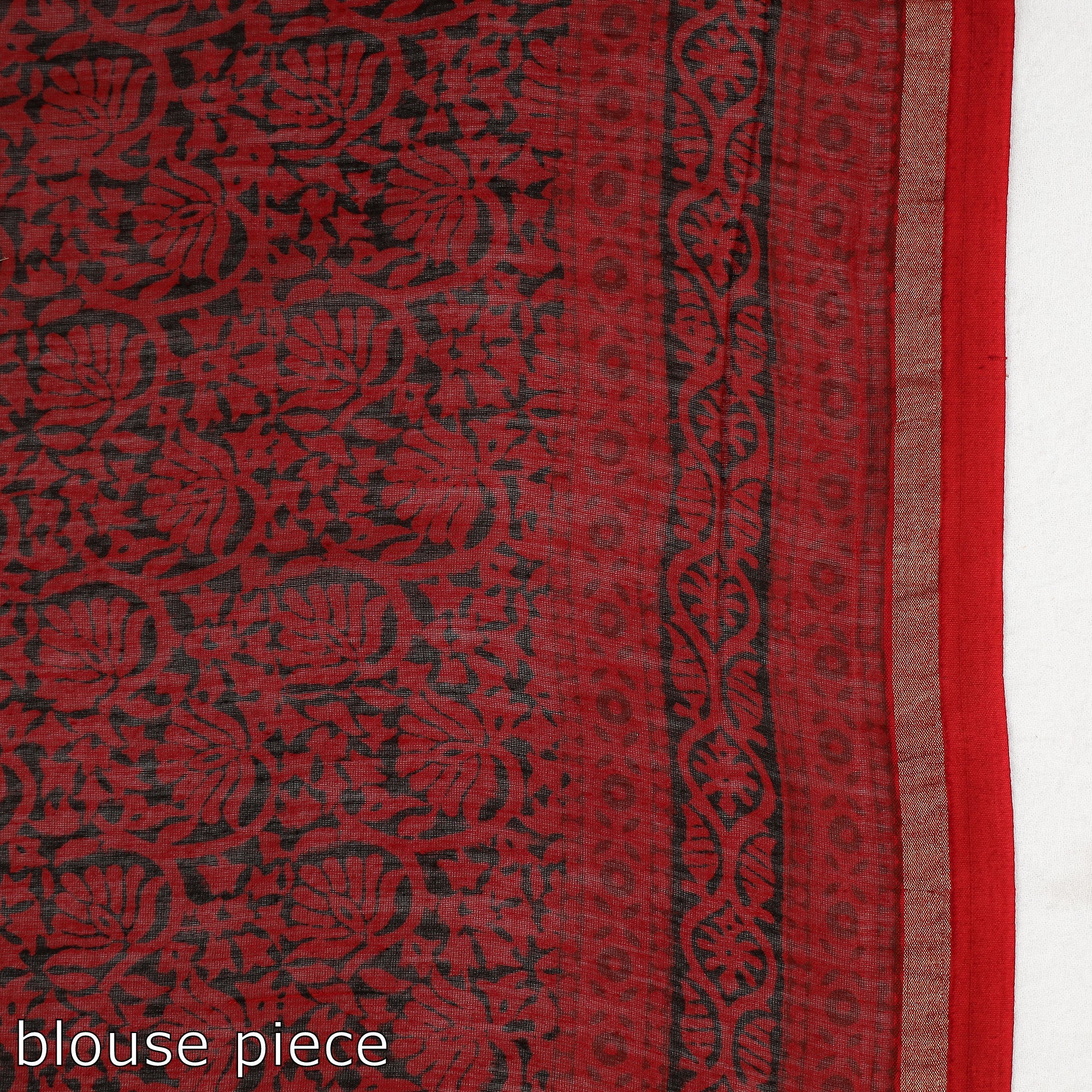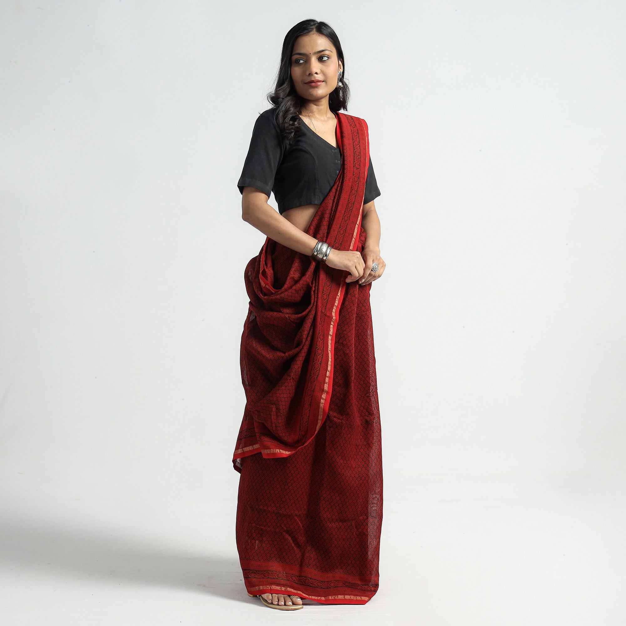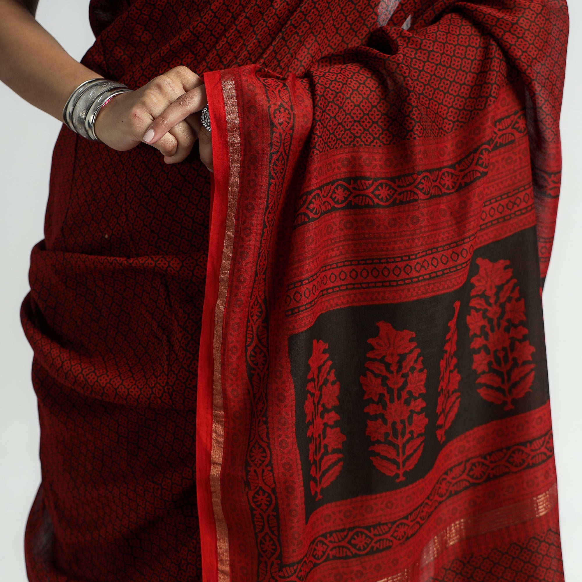 Experience the elegance of a red Bagh block-printed chanderi silk saree. Created by master artisan Bilal Khatri, this exquisite piece showcases intricate motifs and vibrant colours achieved through traditional hand block printing. Made with natural dyes, it embodies the rich cultural heritage of Bagh, in the Dhar district of Madhya Pradesh.