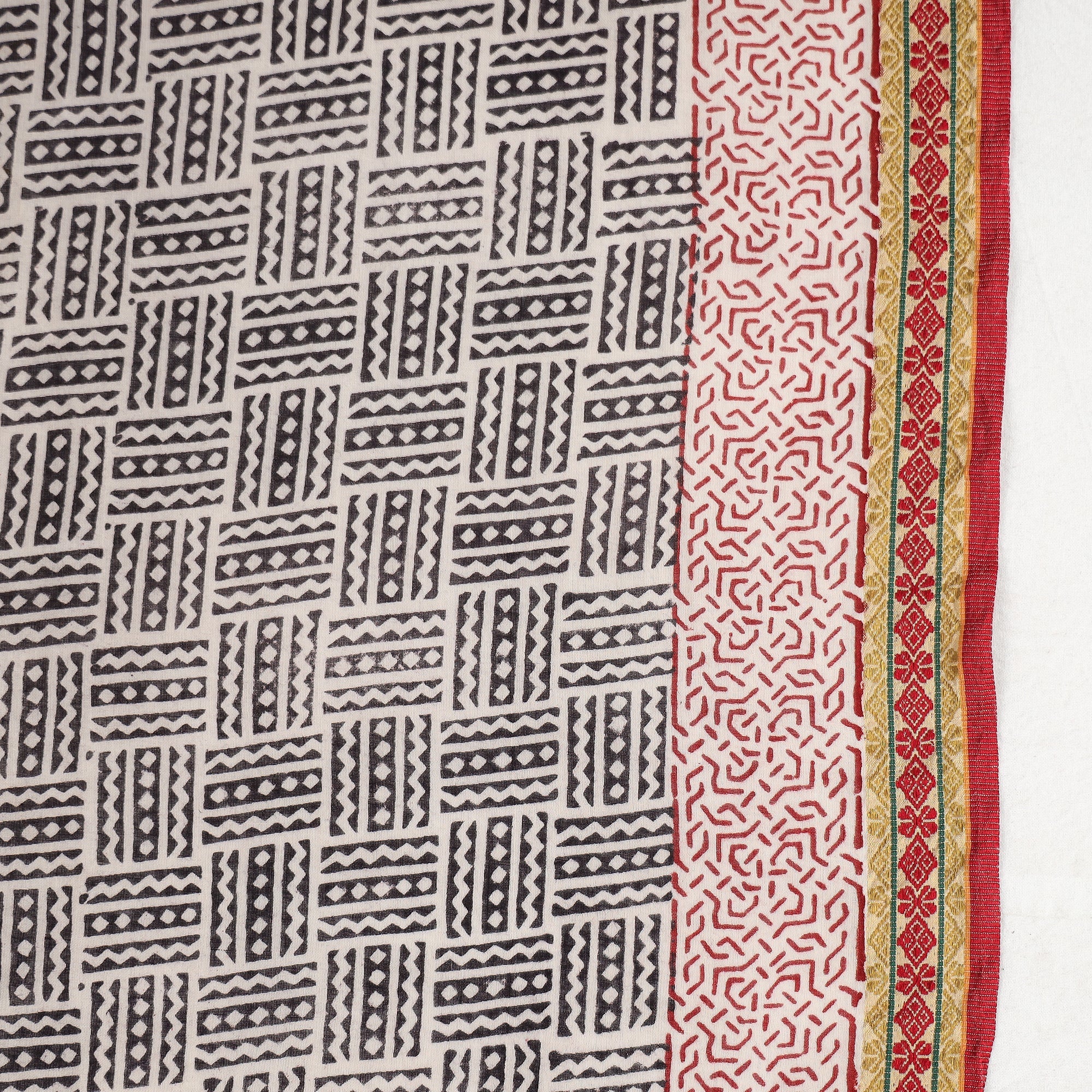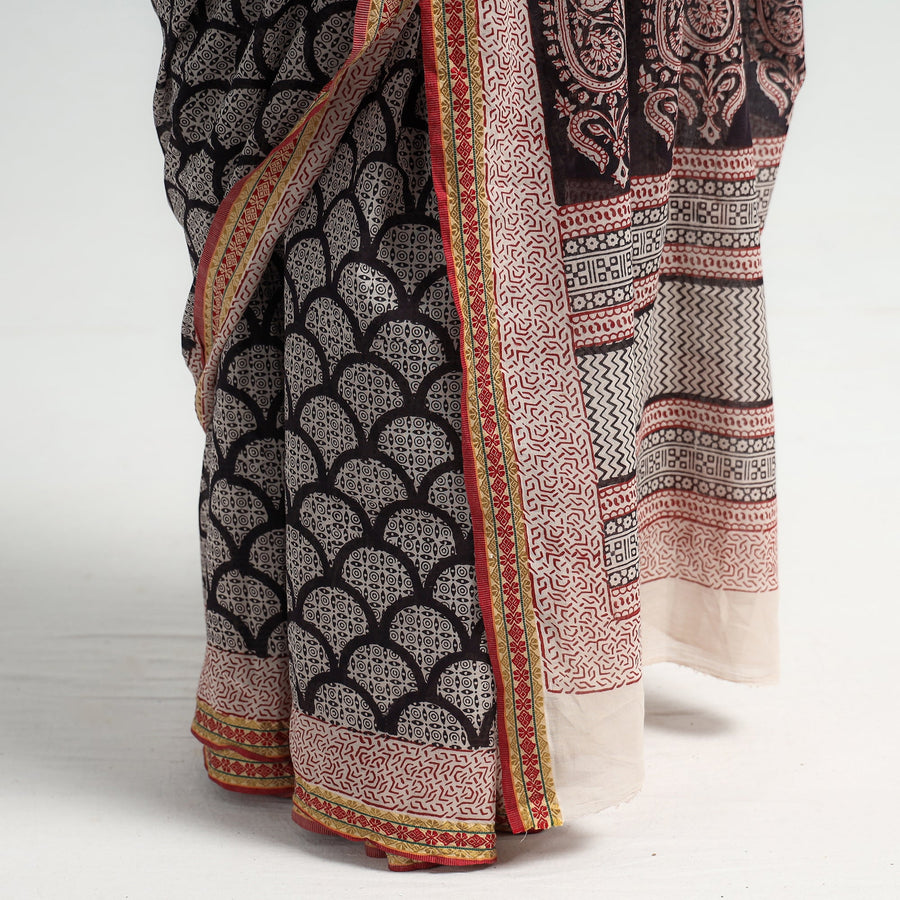 Experience the elegance of a black Bagh block-printed cotton saree with zari border. Created by master artisan mohammed bilal Khatri, this exquisite piece showcases intricate motifs and vibrant colours achieved through traditional hand block printing. Made with natural dyes, it embodies the rich cultural heritage of Bagh, in the Dhar district of Madhya Pradesh.