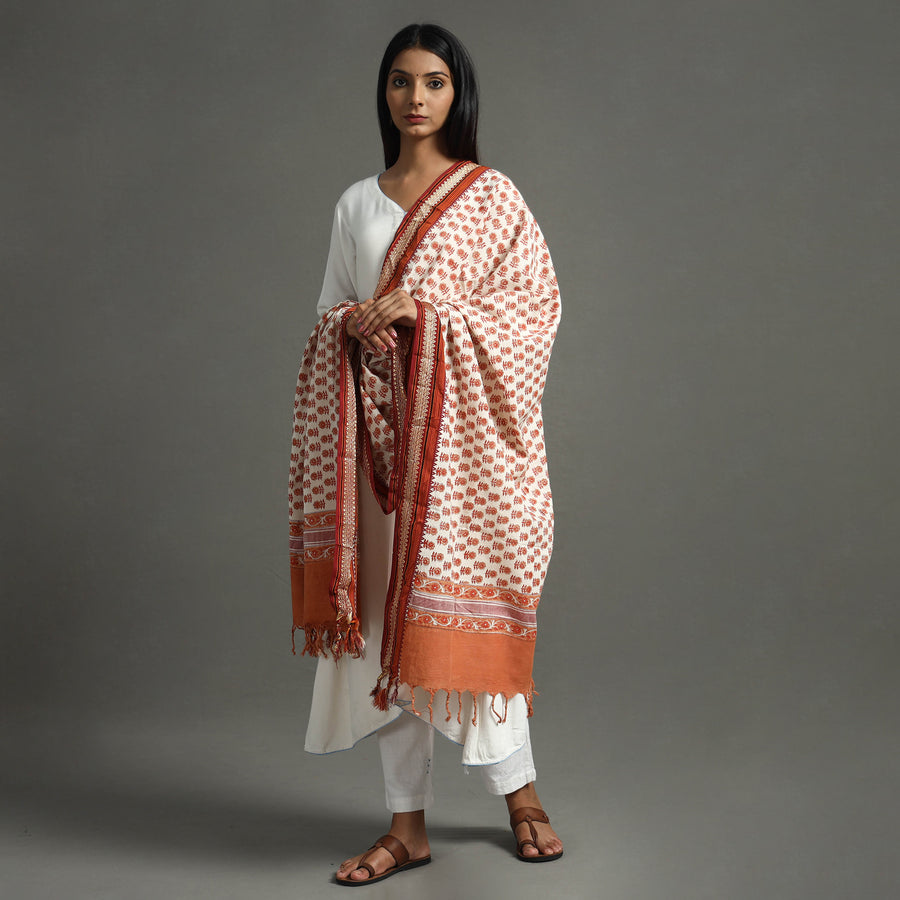 Fine quality orange sanganeri hand block printing pure cotton dupatta with border & tassels. Sanganeri is a hand-block printing technique originating from Sanganer, a village in the southern part of Jaipur, Rajasthan.