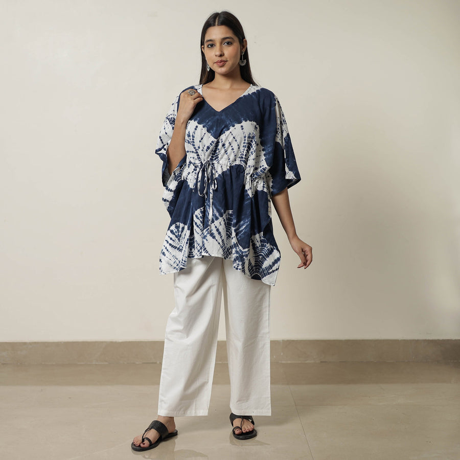 | Material | Fine quality blue shibori tie-dye cotton night suit / loungewear. This suit consists of a short tie-up cotton kaftan paired with an elasticated pyjama. These cotton night suits are enhanced by beautiful shibori tie-dye pattern. This outfit allows you to move and sleep with ease and comfort and is stylish enough to lounge in! The drawstring, elasticated tie-up waist will give you the freedom to customize the fit to suit your unique shape. |