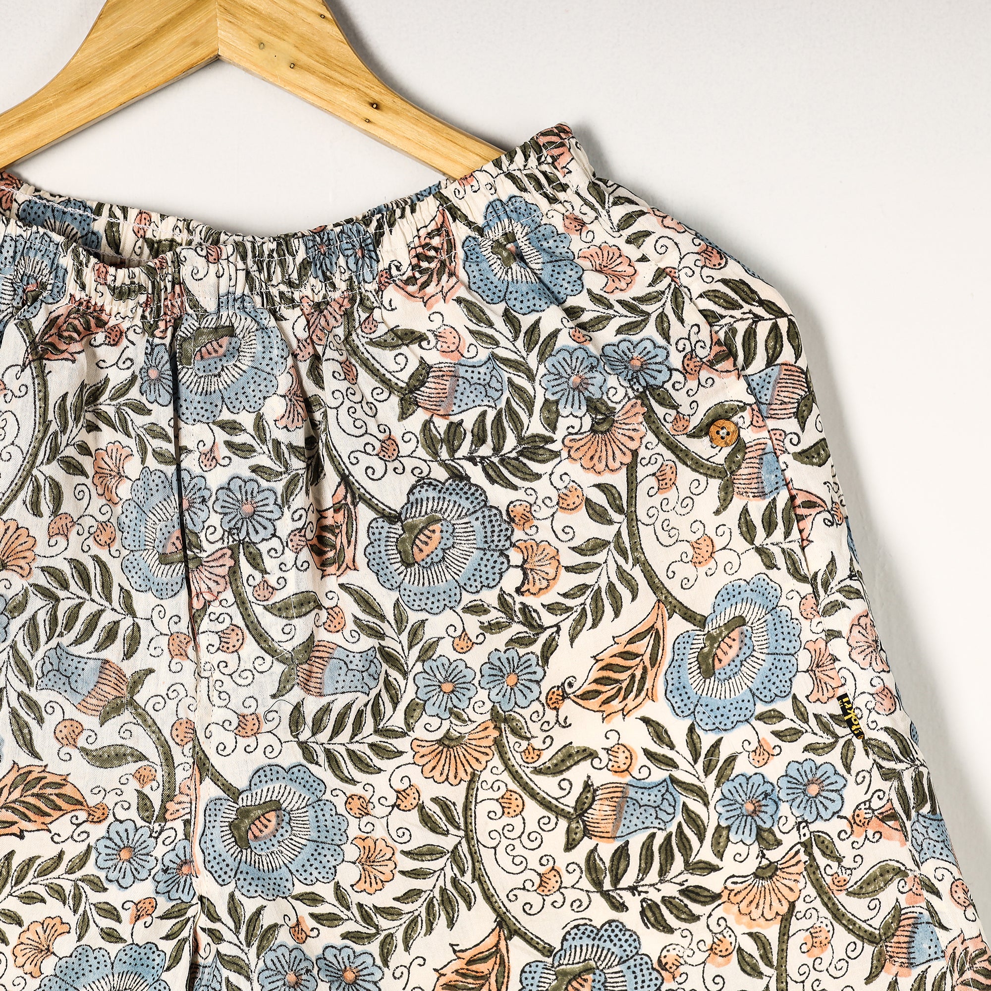 Material Composition : 100% Cotton Cotton handmade fabric with Sanganeri hand block printing Ultrasoft and durable inner waistband Button placket with front fly open Side pockets with button plackets Label free for all day comfort