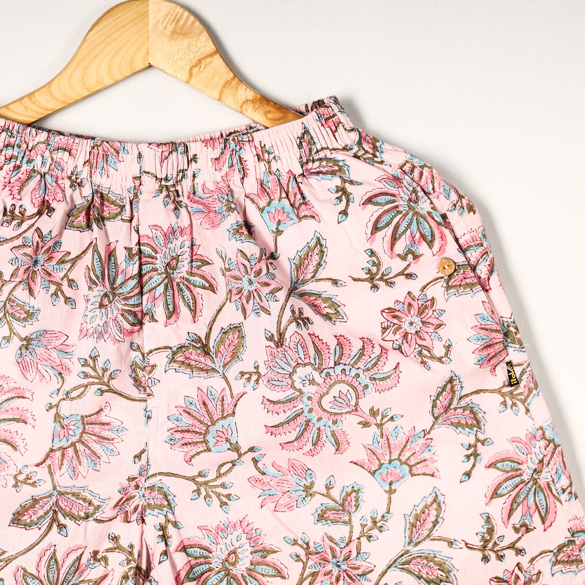 Material Composition : 100% Cotton Cotton handmade fabric with Sanganeri hand block printing Ultrasoft and durable inner waistband Button placket with front fly open Side pockets with button plackets Label free for all day comfort
