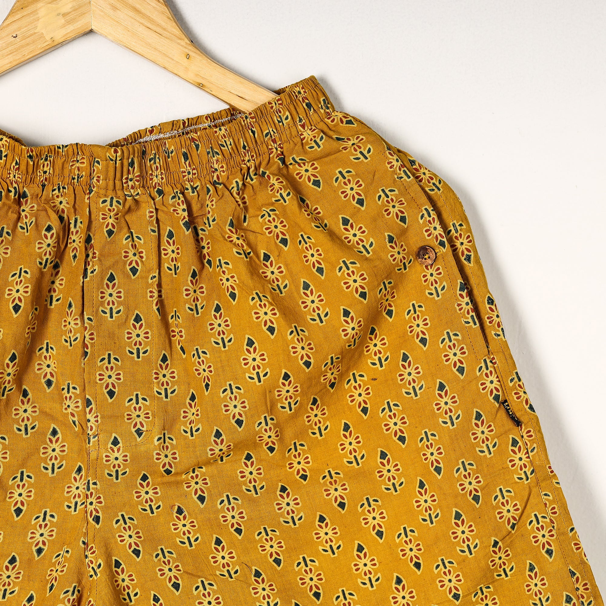 Material Composition : 100% Cotton Cotton handmade fabric with ajrakh hand block printing Ultrasoft and durable inner waistband Button placket with front fly open Side pockets with button plackets Label free for all day comfort