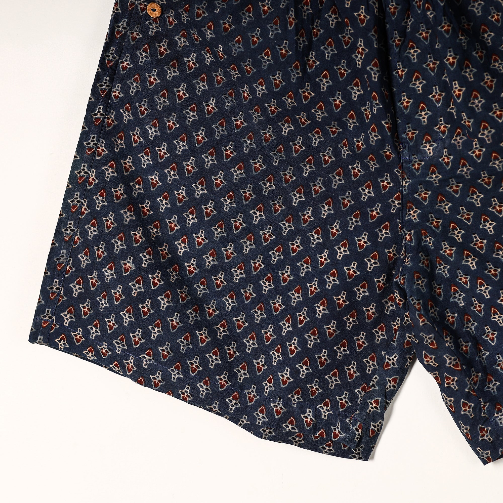 Material Composition : 100% Cotton Cotton handmade fabric with ajrakh hand block printing Ultrasoft and durable inner waistband Button placket with front fly open Side pockets with button plackets Label free for all day comfort
