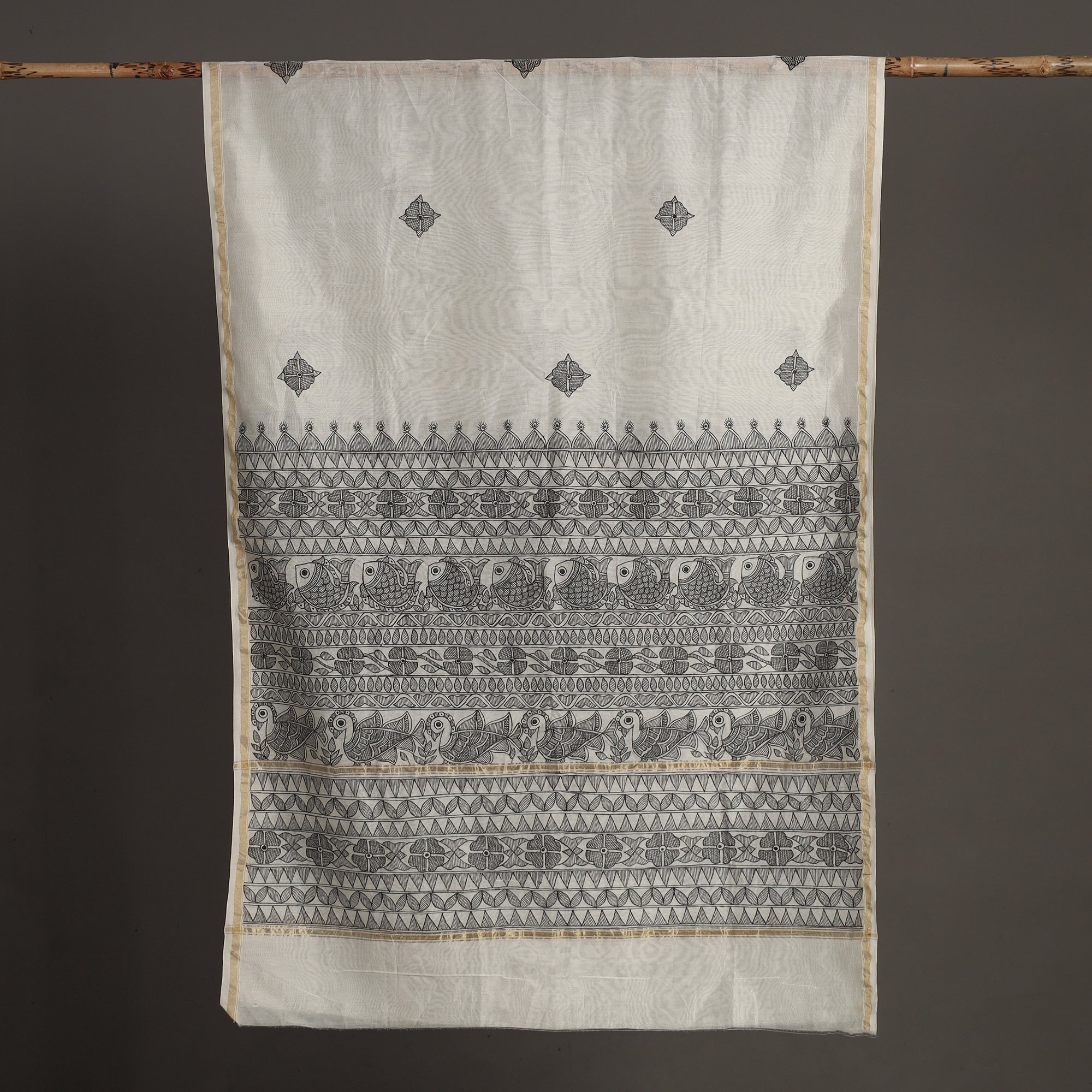 Finest pure handloom madhubani handpainted chanderi silk-cotton zari border dupatta is crafted from a blend of fine silk and cotton, known for its luxurious feel and lightweight texture. This dupatta is skillfully handpainted with intricate Madhubani artwork by master artisan Hira Devi from Bihar, showcasing the rich cultural heritage of the region.