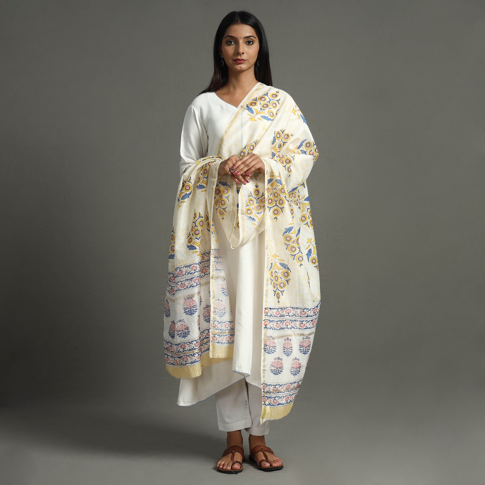 Fine-quality sanganeri hand block-printed handloom chanderi silk dupatta with zari border. made using bleed-free VAT dyes. Sanganeri is a hand-block printing technique originating from Sanganer, a village in the southern part of Jaipur, Rajasthan. Chanderi silks are known for their gossamer looks and amazing feel. Chanderi weaving is practiced in the historic town of Chanderi in Madhya Pradesh.