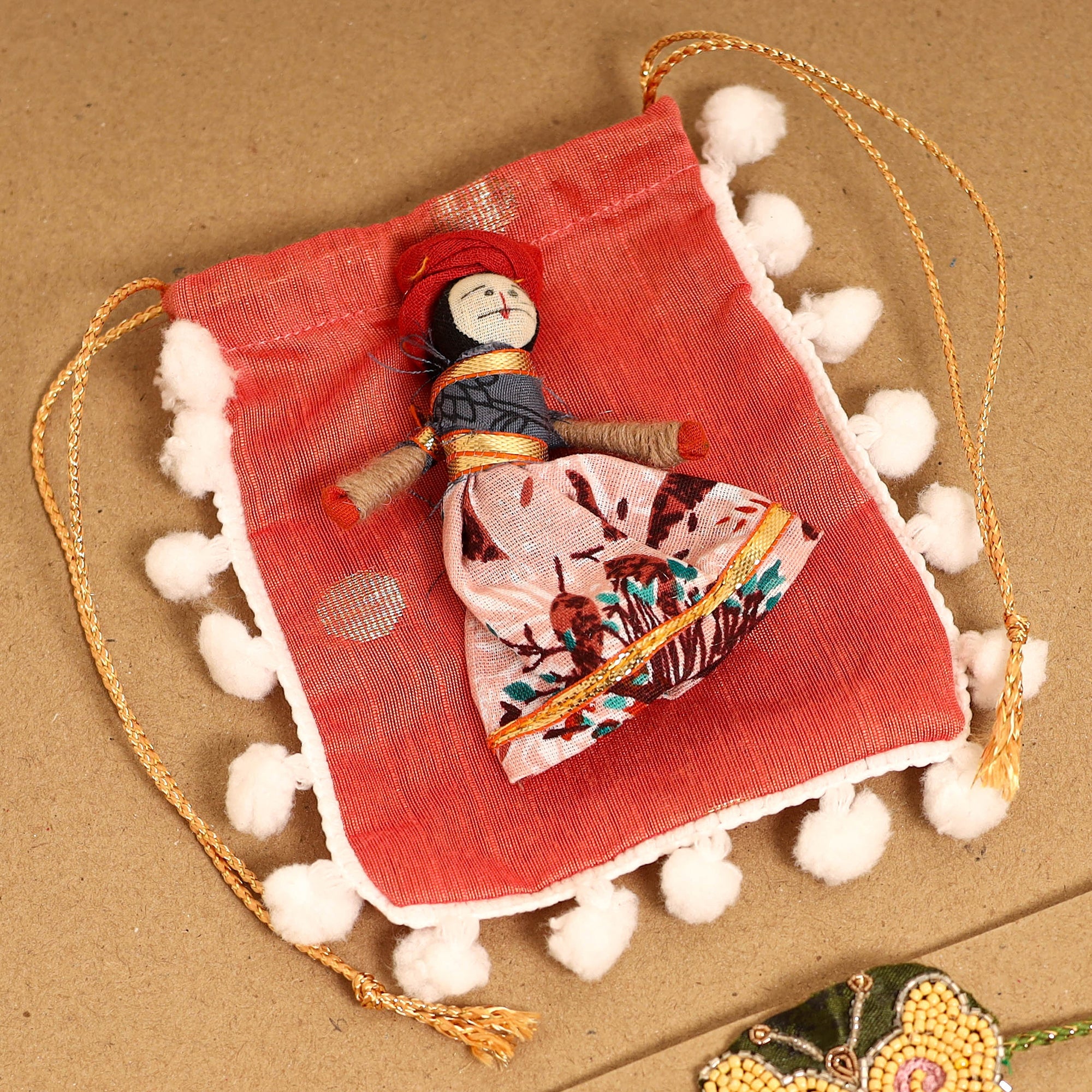 Colorful glass beads & thread work rakhi handcrafted for the very special khatta meetha bond between brother and sister. This Rakhi will come with a potli for added charm. Bursting with vibrant colours and crafted with love, this unique piece symbolizes the joyous connection between a brother and sister.