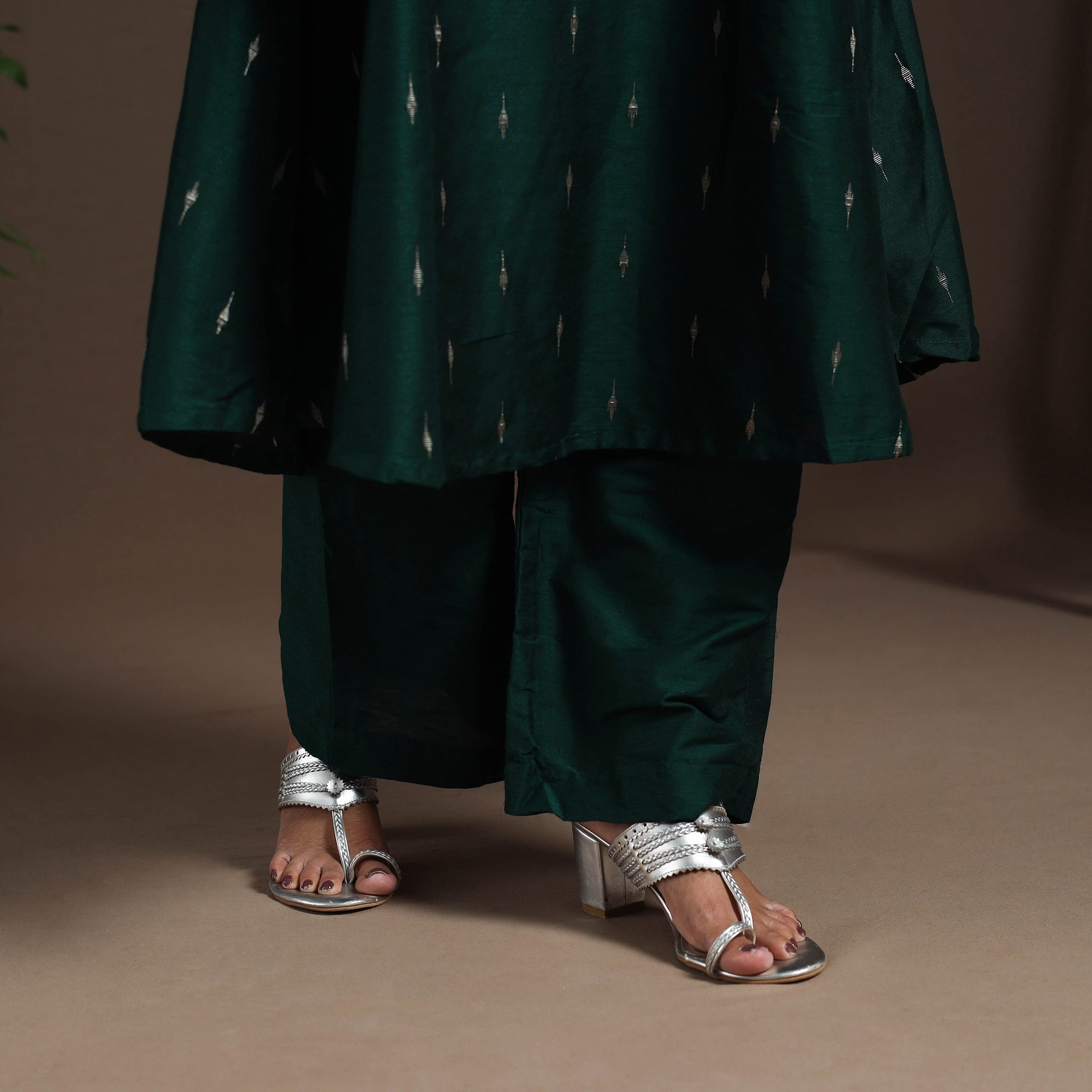 This uniquely designed green buti work A-line kurta set, made from a spun dupion silk look viscose-polyester blend, embodies effortless elegance. The kurta includes a single side pocket and is paired with matching plain slub silk look palazzos with an elasticized waistband and two functional side pockets for extra comfort. Soft, breathable, and chic, this kurta set is perfect for both everyday wear and festive occasions.