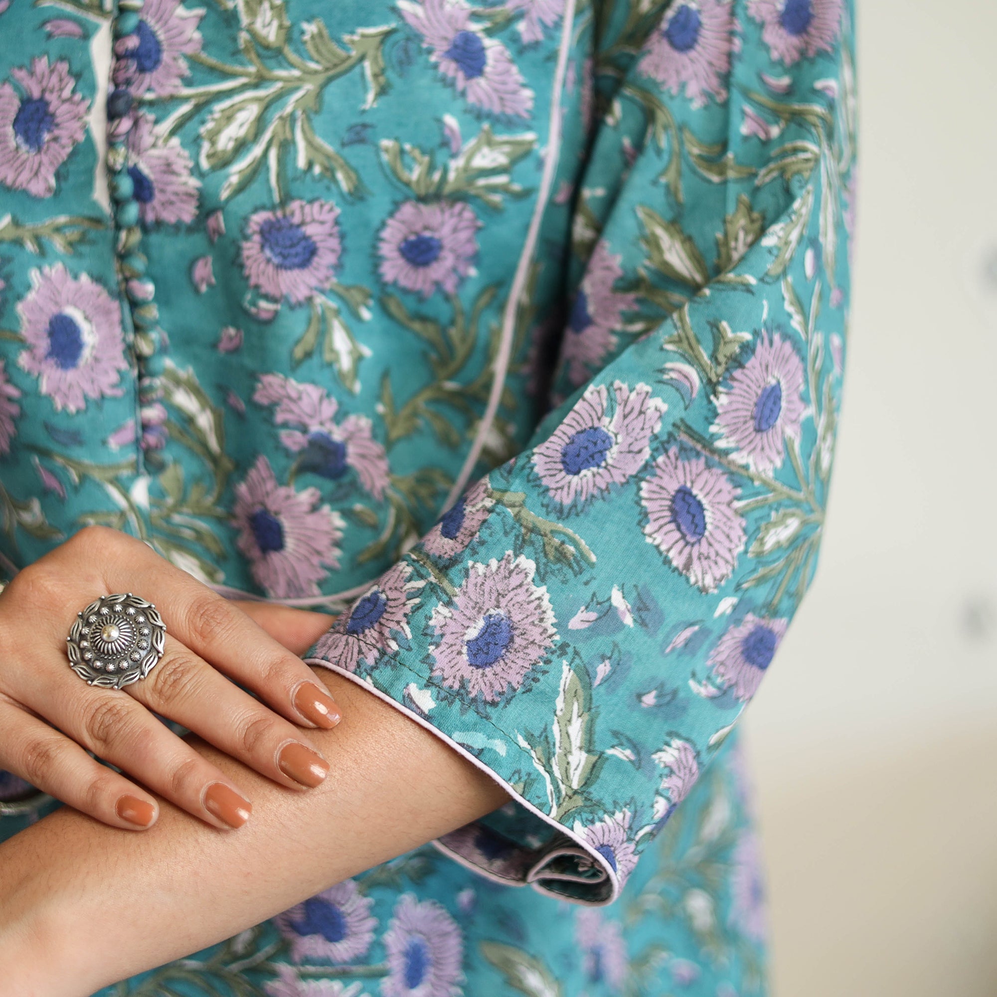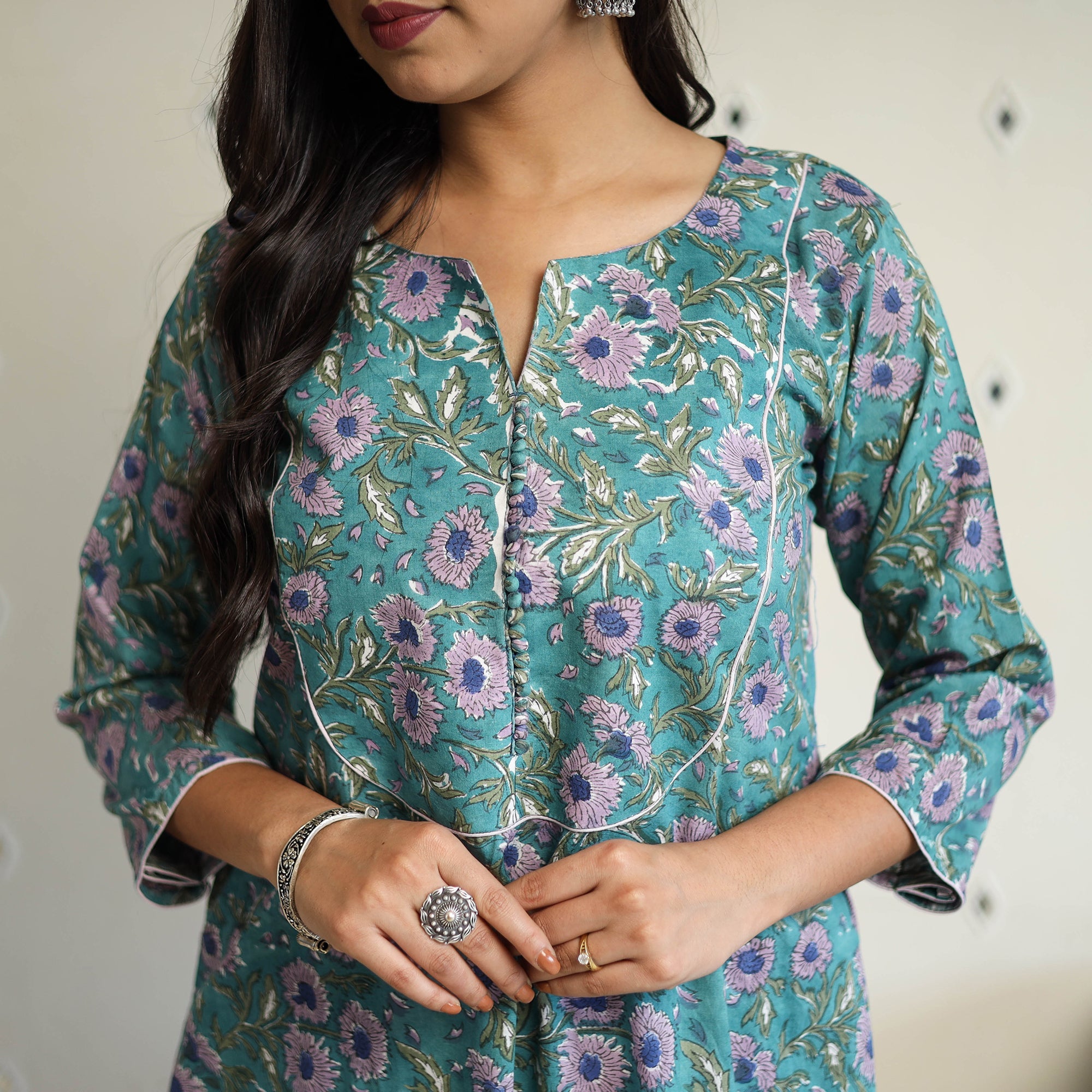 Embrace the beauty of tradition with this green sanganeri hand block printed cotton A-line kurta. Featuring a convenient side pocket, this kurta blends everyday comfort with elegant design. Crafted by skilled artisans using sanganeri block printing techniques, it adds effortless charm to regular days and special celebrations.