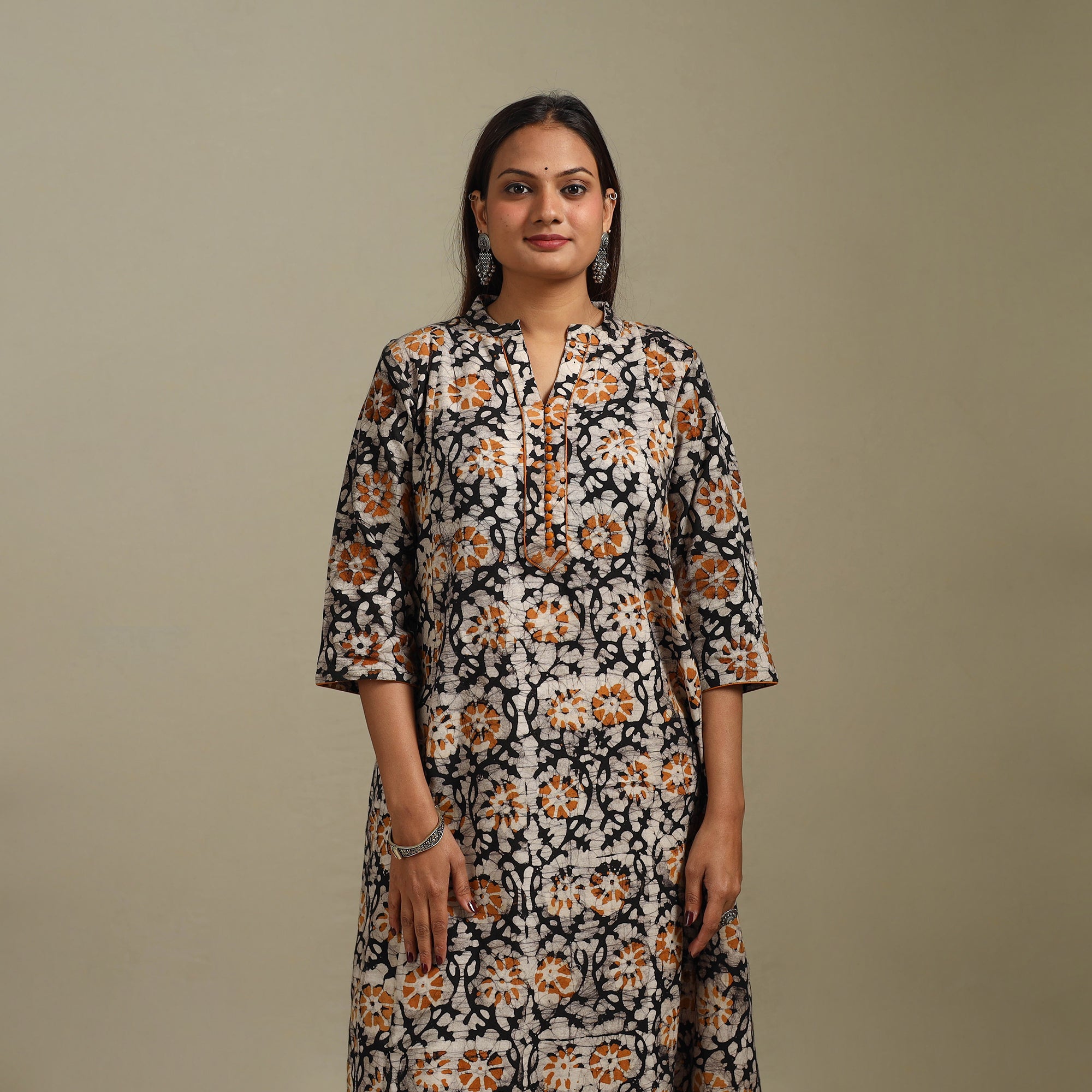 Hand batik print A-line kurta is a perfect mix of tradition and comfort. Created using an age-old wax-resist dyeing process, it features intricate, hand-applied batik block patterns. The breathable cotton fabric keeps you relaxed all day. With a comfortable fit and a side pocket, it’s great for casual outings, office or daily wear.