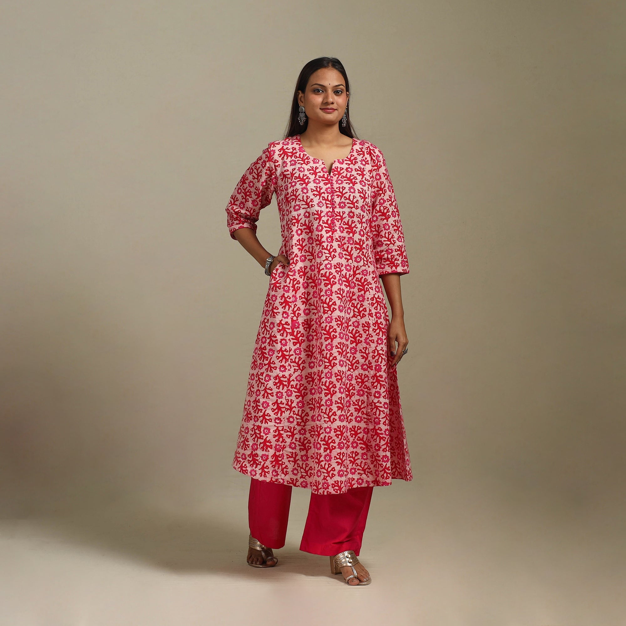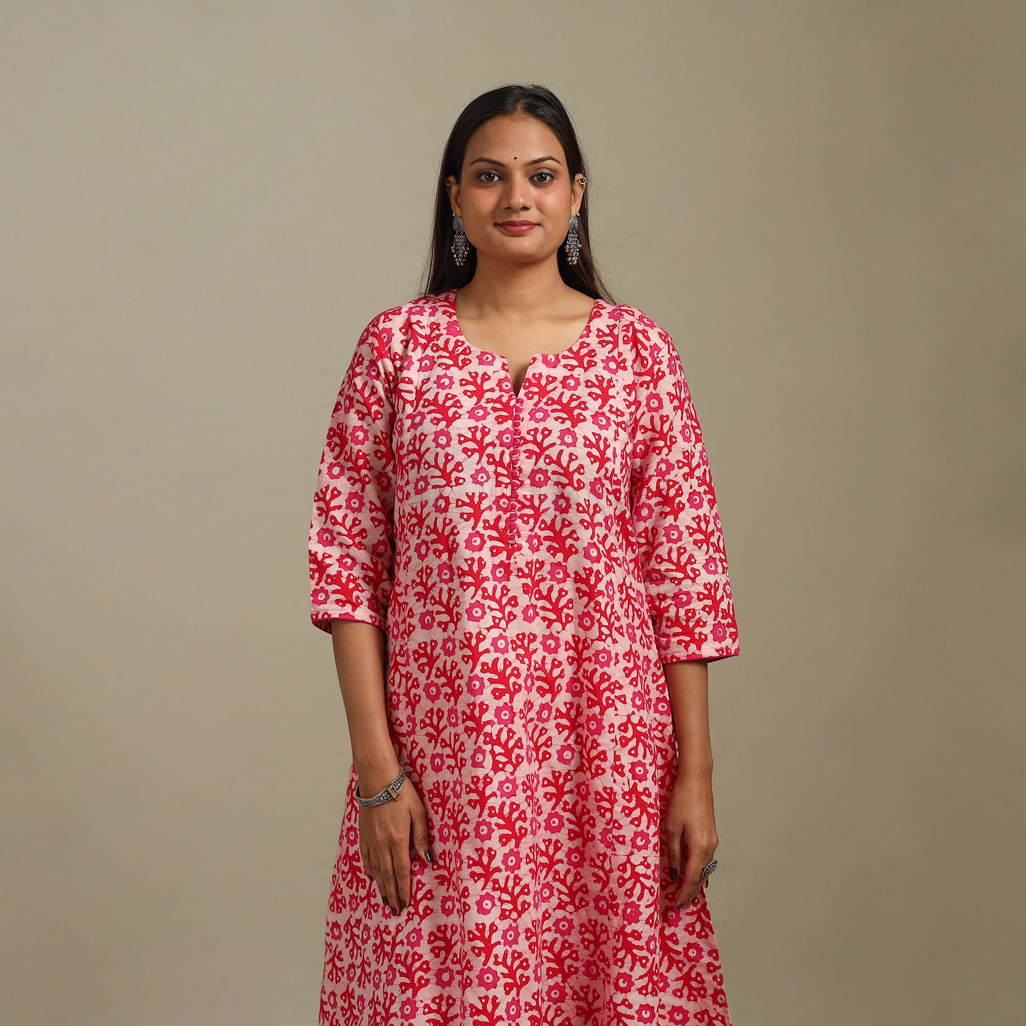 Hand batik print A-line kurta is a perfect mix of tradition and comfort. Created using an age-old wax-resist dyeing process, it features intricate, hand-applied batik block patterns. The breathable cotton fabric keeps you relaxed all day. With a comfortable fit and a side pocket, it’s great for casual outings, office or daily wear.