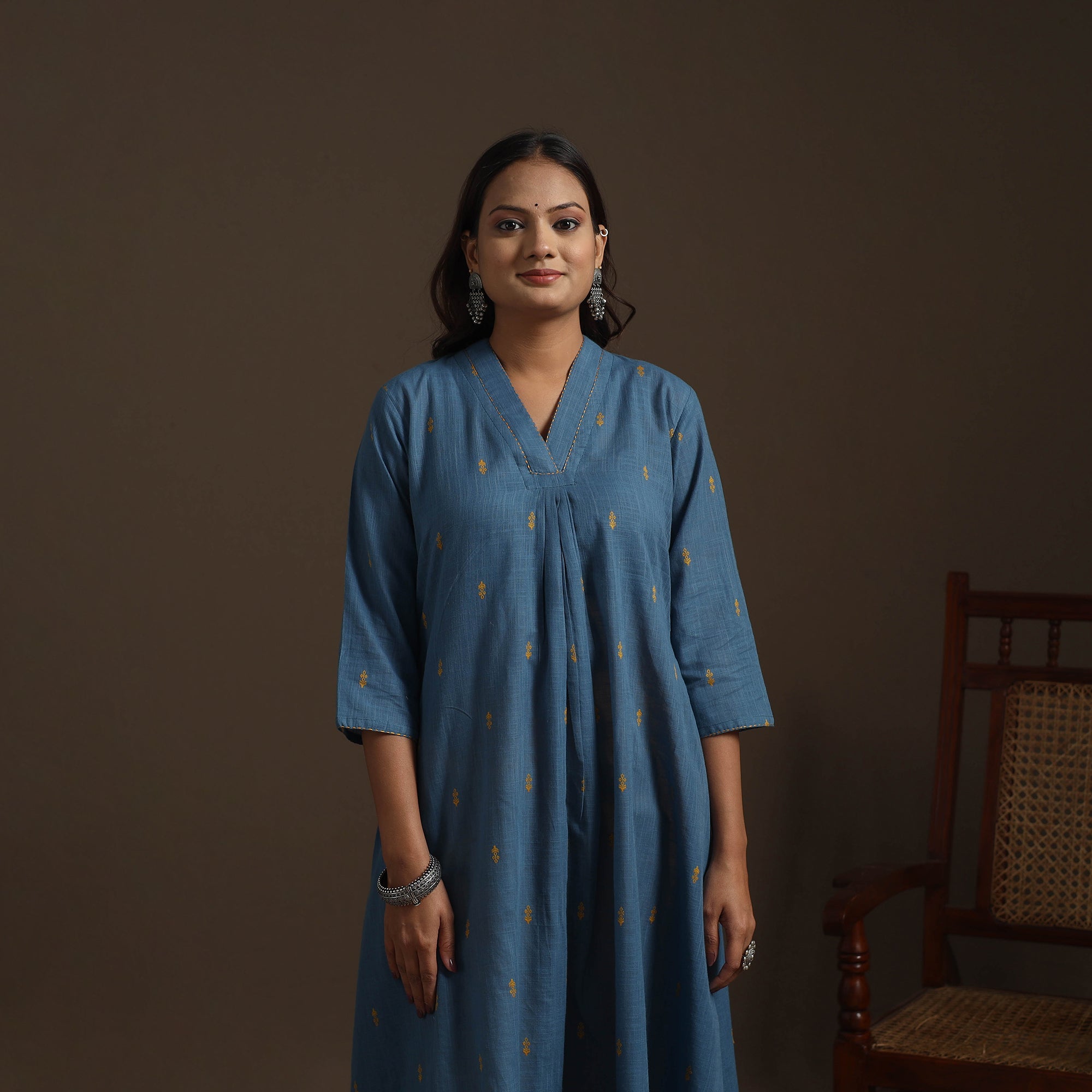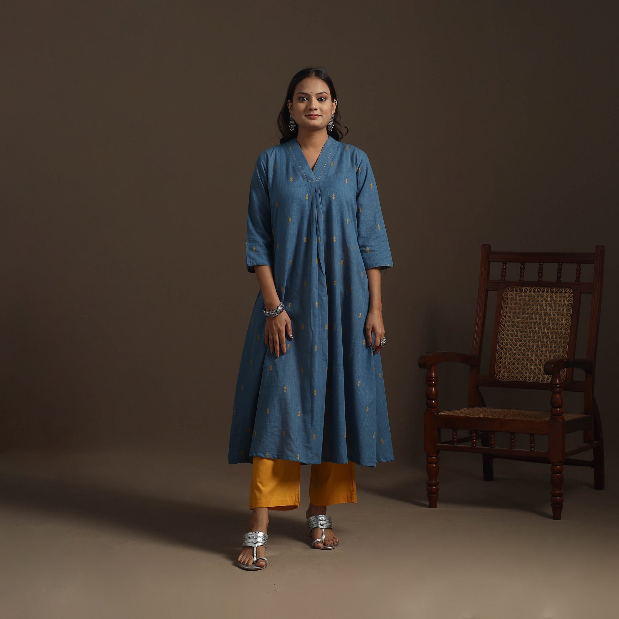 Stay stylish and comfortable in this A-line cotton hand embroidered jacquard kurta. The jacquard weave embeds patterns directly into the fabric, adding a soft texture you can both see and feel. Designed with a convenient side pocket for your essentials, this kurta is perfect for office wear or a relaxed day out.