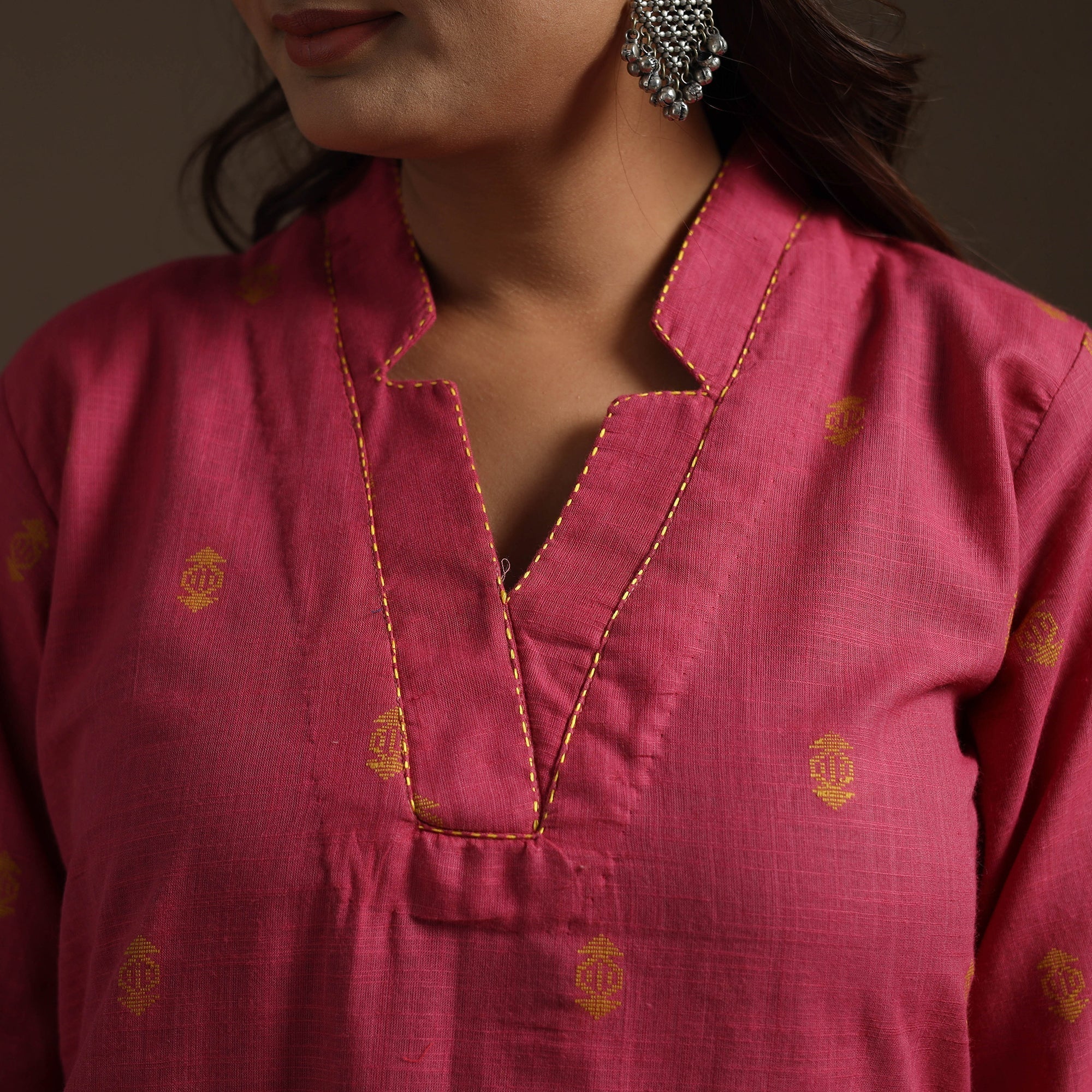 Stay stylish and comfortable in this pink A-line cotton hand embroidered jacquard kurta. The jacquard weave embeds patterns directly into the fabric, adding a soft texture you can both see and feel. Designed with a convenient side pocket for your essentials, this kurta is perfect for office wear or a relaxed day out.