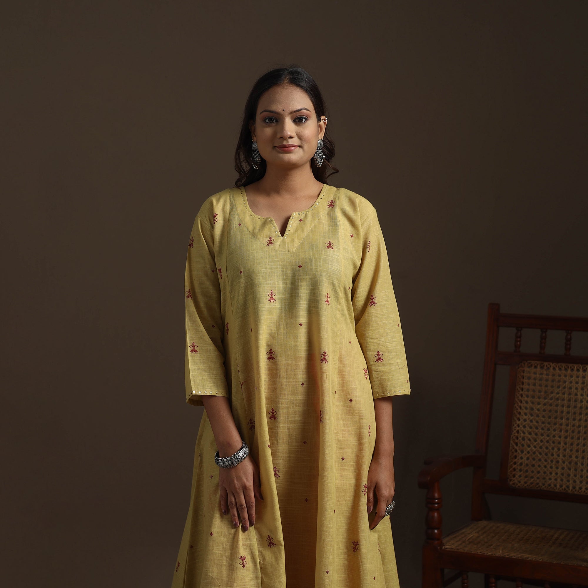 Stay stylish and comfortable in this yellow A-line cotton hand embroidered jacquard kurta. The jacquard weave embeds patterns directly into the fabric, adding a soft texture you can both see and feel. Designed with a convenient side pocket for your essentials, this kurta is perfect for office wear or a relaxed day out.