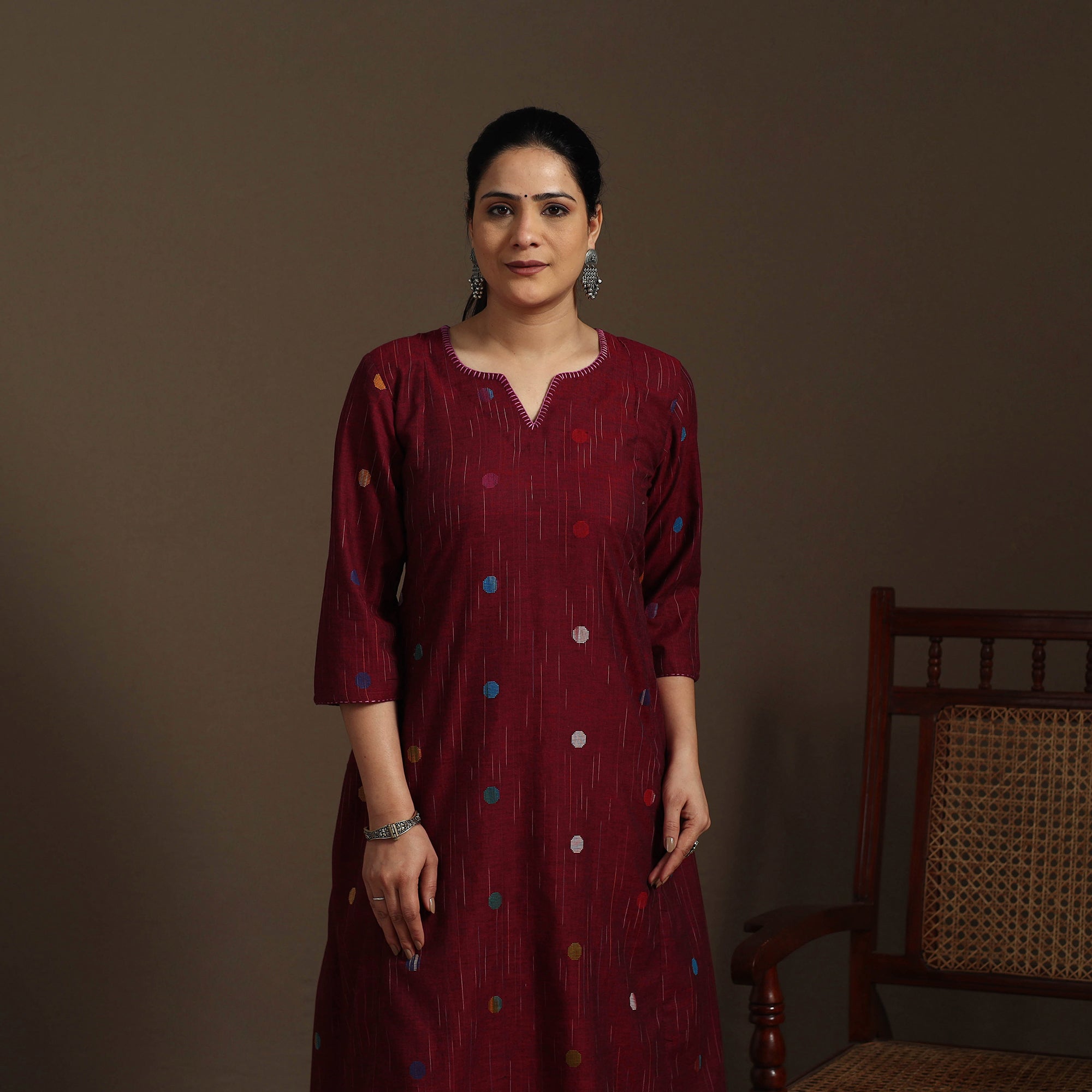 Stay stylish and comfortable in this maroon A-line cotton hand embroidered jacquard kurta. The jacquard weave embeds patterns directly into the fabric, adding a soft texture you can both see and feel. Designed with a convenient side pocket for your essentials, this kurta is perfect for office wear or a relaxed day out.