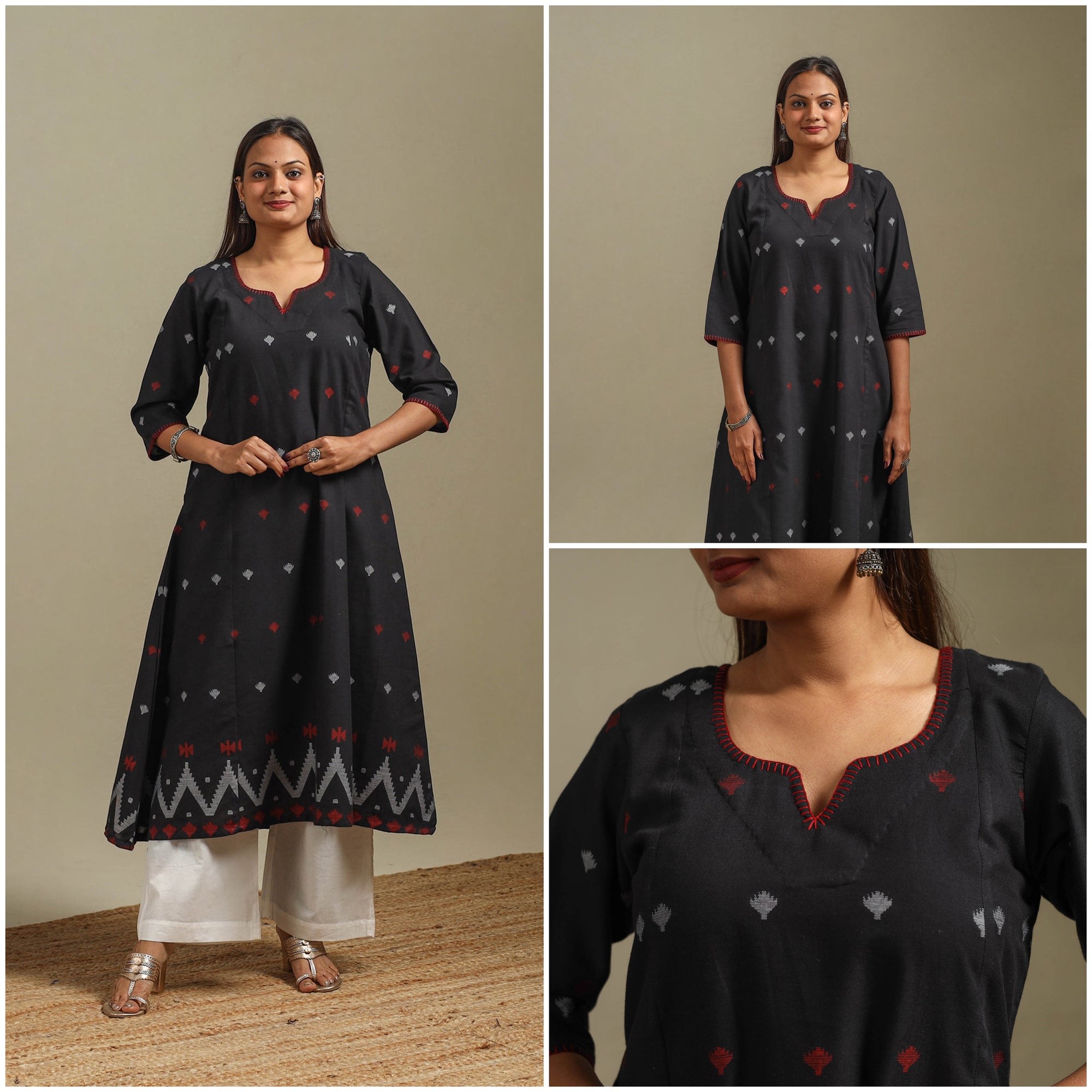 A-Line Cotton Hand Embroidered Jamdani Border Thread Buti Kurta for women 12